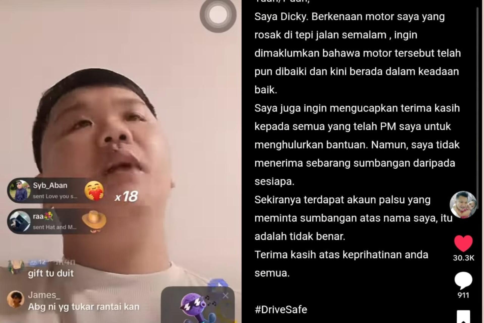 针对事发当天的视频,Dicky在提到一位路人挺身而出,免费帮他修理摩托车且不求回报时,他激动得落泪。