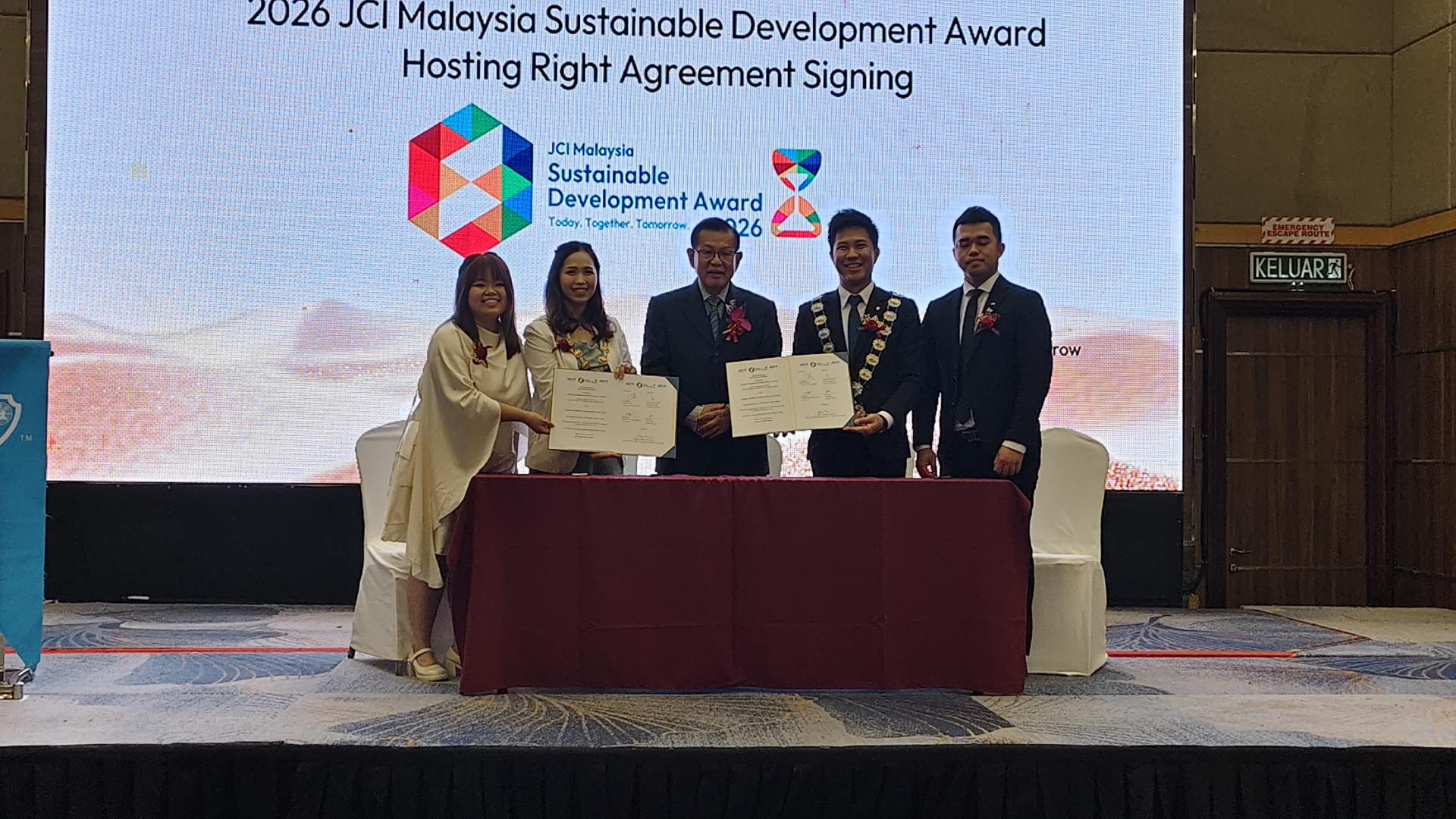 罗东国际青年商会在李景胜(中)见证下签署2026年马来西亚国际青年商会永续发展奖协议。