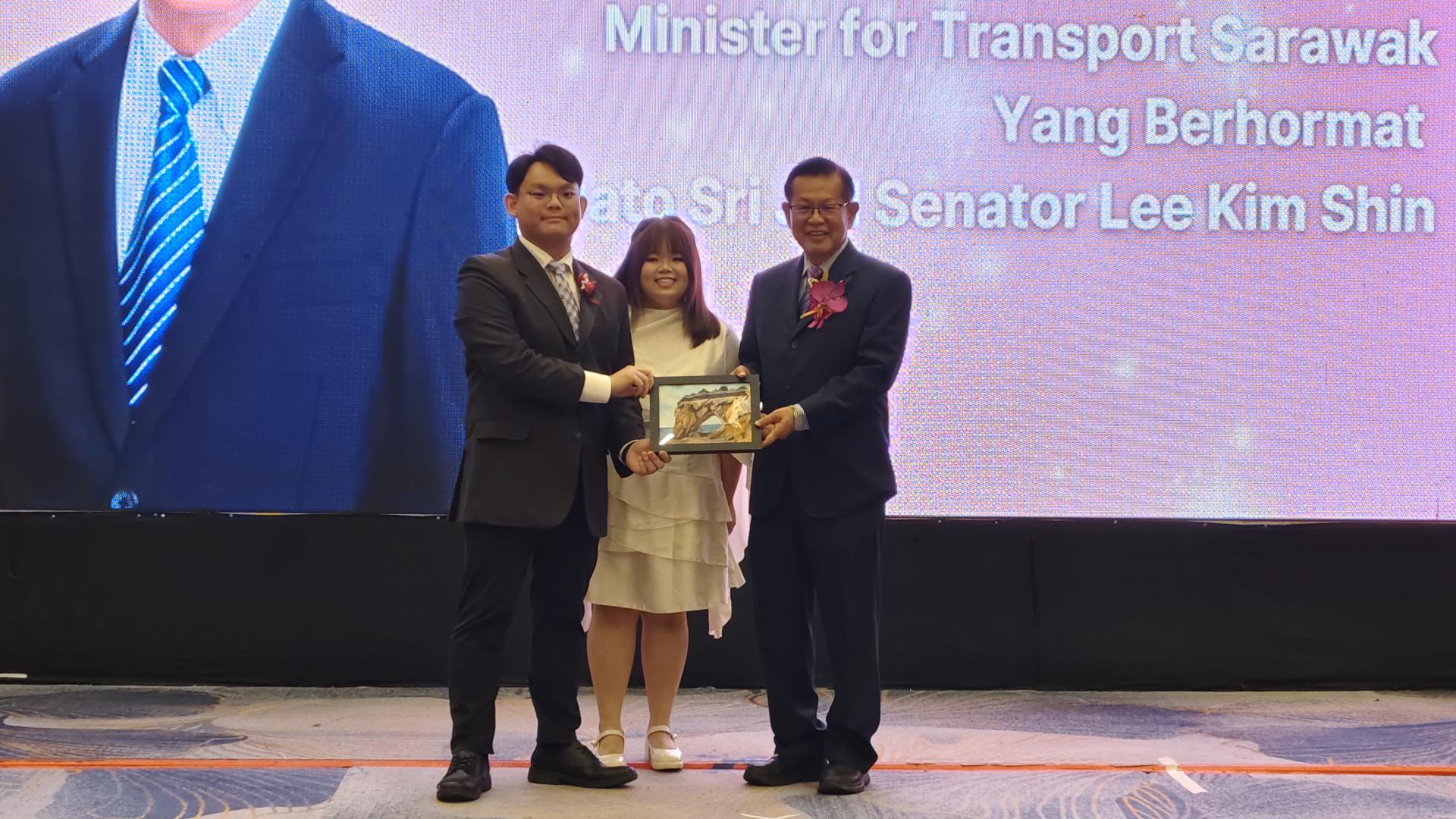 罗东国际青年商会第56届董事就职典礼暨表扬午宴筹备会主席黎经耀(左)赠送图画给李景胜(右)。中为雷巧薇。