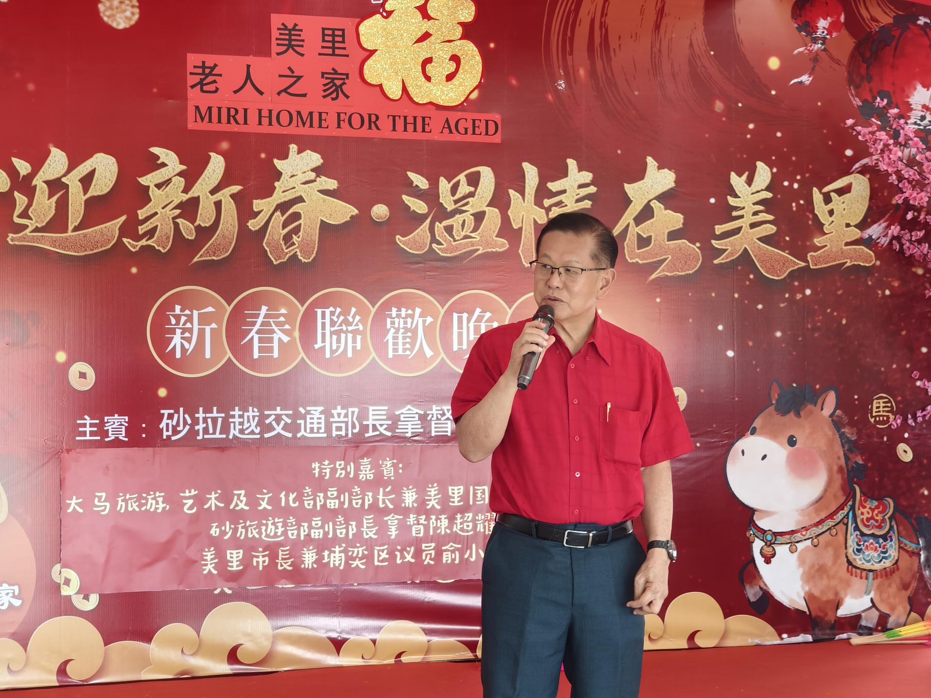 (本报美里31日讯)砂拉越交通部长兼砂拉越广东乡团联合会永久名誉顾问拿督斯里李景胜表示,这是他今年第二次出席老人之家相关社团的关怀活动,欣慰看见社团组织在佳节来临之际,不忘关怀社会上有需要的群体,尤其是长者。