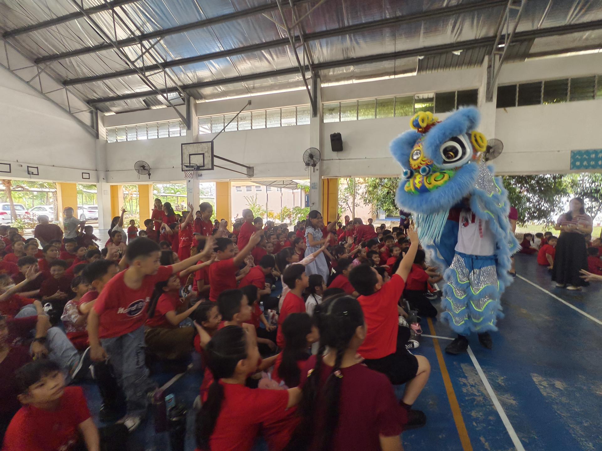 今早全校师生身穿红衣迎新春,现场洋溢浓厚佳节气氛。活动上演美中醒狮团舞狮、校友舞龙表演,以及舞蹈《好运来》、合唱《新年新希望》与舞蹈《太平鼓》等节目,场面热闹非凡。