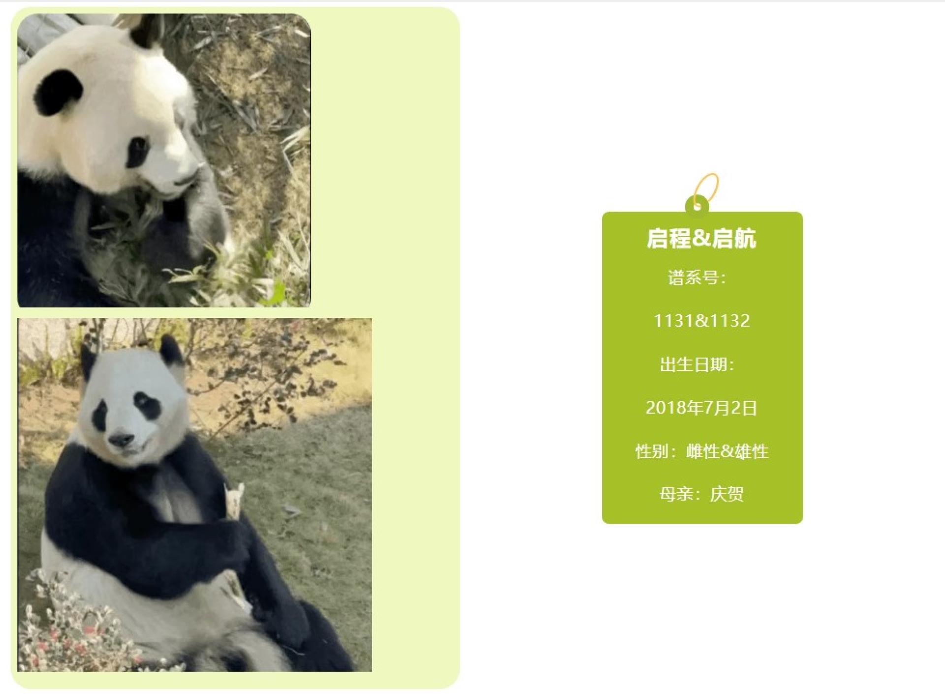 “启航”与“启程”是一对龙凤胎姐弟,“启程”是姐姐,“启航”是弟弟。“启航”因为其高颜值和“爱岗敬业”,被大家称为熊猫谷最闪亮的“迎宾熊”。 “启程”则是此次来到福州的五只大熊猫中唯一的“女熊”。姐弟俩感情好,日常一起吃竹、玩耍、晒太阳,互动和睦。