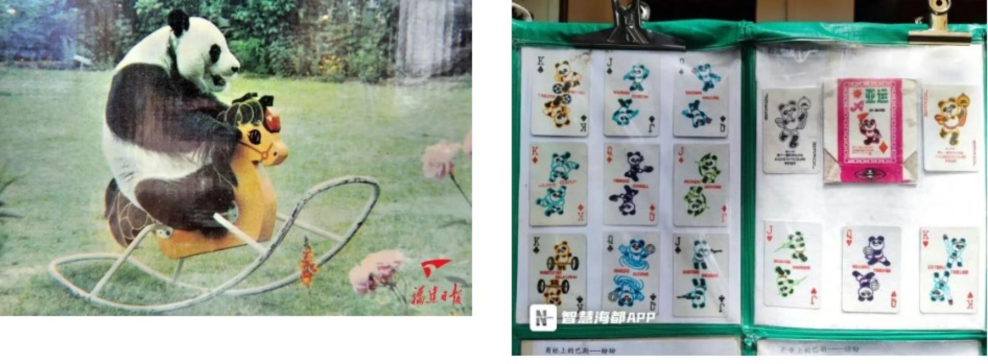 左:“巴斯”骑木马 右:以“巴斯”为形象的“盼盼”亚运扑克牌 在关于福建的熊猫记忆里,最璀璨的那颗星,一定是大熊猫“巴斯”。它不仅是北京亚运会吉祥物“盼盼”的原型,更以37岁的高龄创下圈养大熊猫的最长寿纪录。它在福州生活了33年,从某种意义上说,“巴斯”已经从一个生物个体,升华为一个代表“和平、友爱、坚韧”的文化符号,深深地融入了福建的地域文化血脉之中。