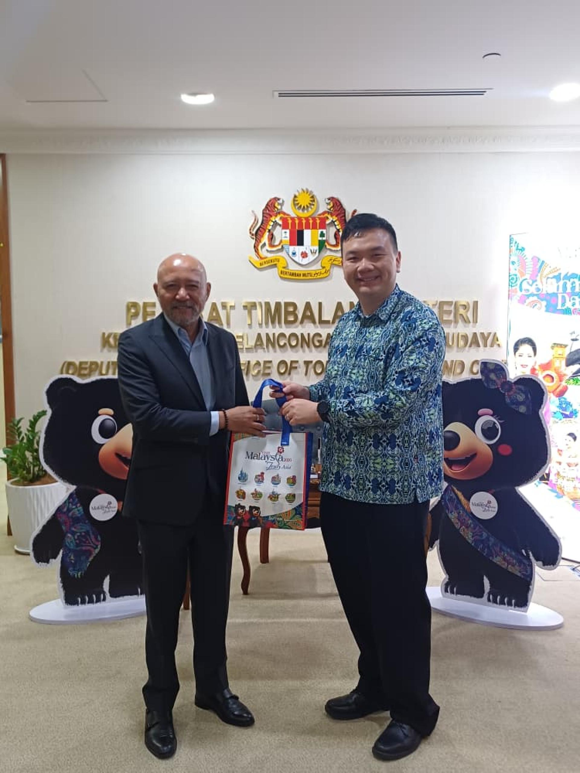 赵俊文(右)赠送旅游、艺术及文化部纪念品给赛阿扎尔。