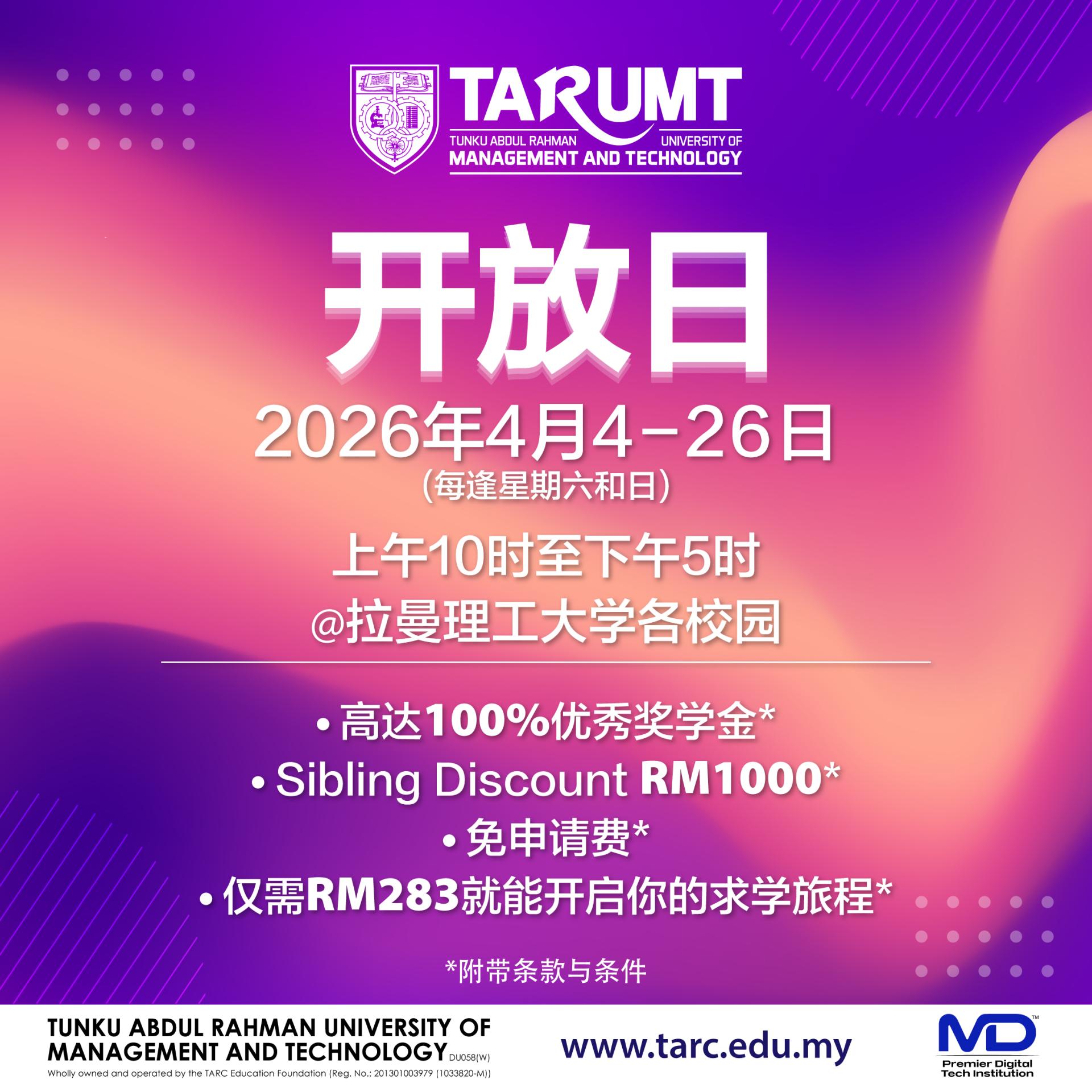 欲知更多详情,请致电 +603-41450100/23 分线 3726,手机号码 +6011 – 1084 3326 或浏览大学官网 www.tarc.edu.my 面子书专页Tunku Abdul Rahman University of Management and Technology 或 IG帐号 @tarumt.official.