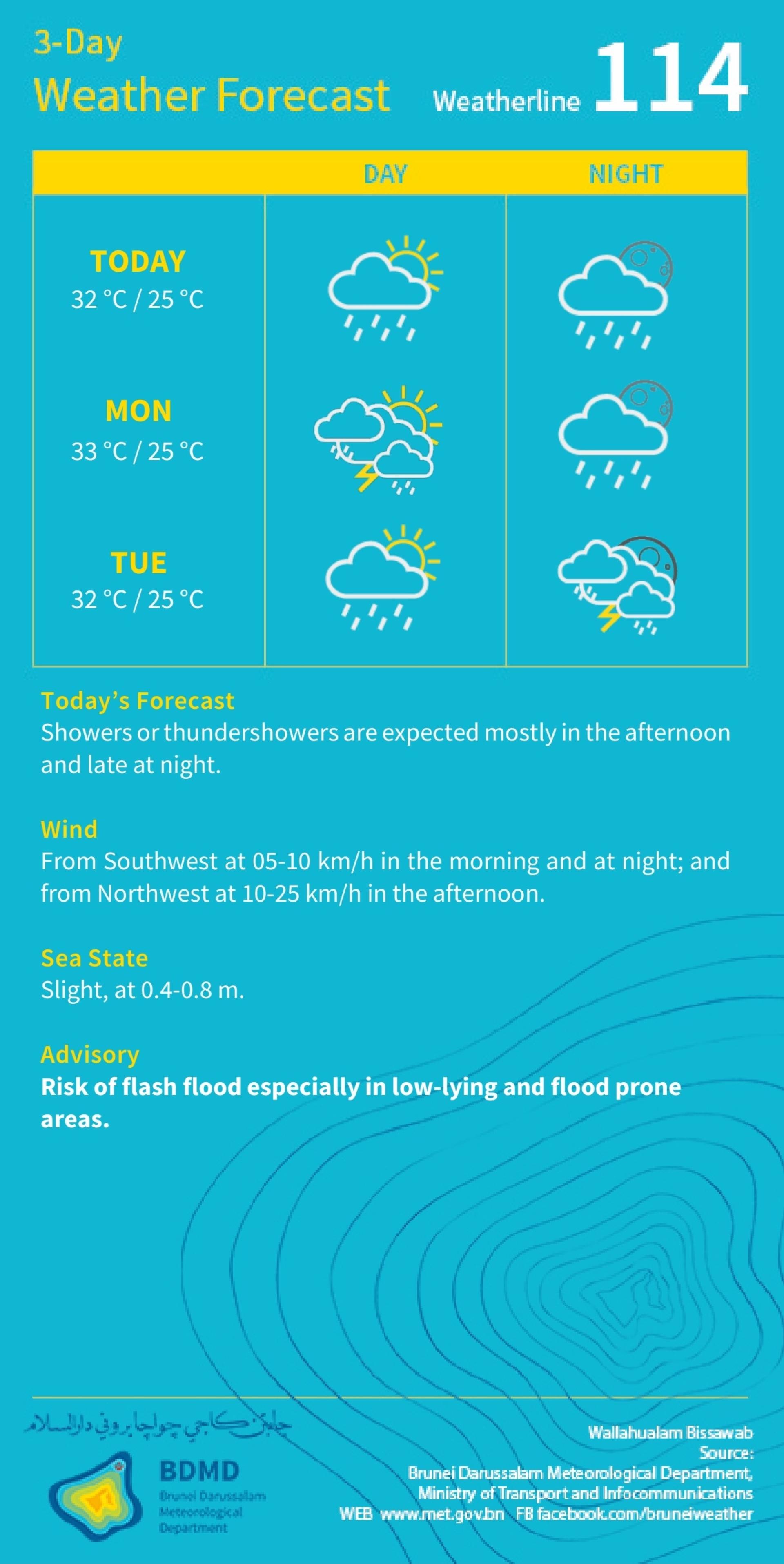 (斯市4日讯)汶莱气象局今日发布未来三天天气预报指出,全国各地预计将持续出现阵雨及雷阵雨天气,尤其在下午及夜间时段更为明显。
