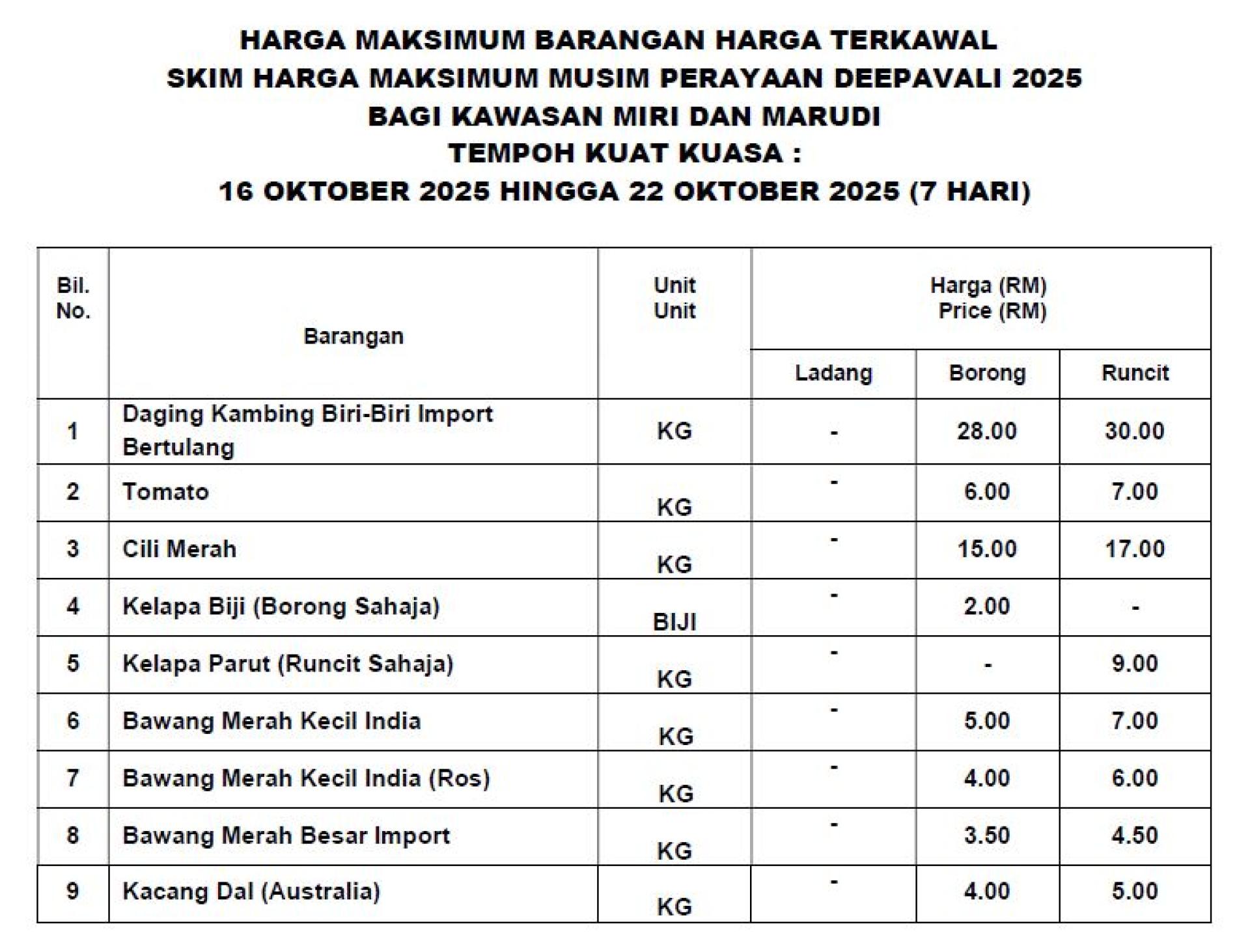 (本报美里14日讯)为配合屠妖节的到来,国内贸易及生活成本部宣布,从10月16日至22日在美里及马鲁帝地区落实为期七天的屠妖节2025年节庆商品统制价格,以稳定节日期间主要消费品价格,防止商家趁节庆哄抬物价。