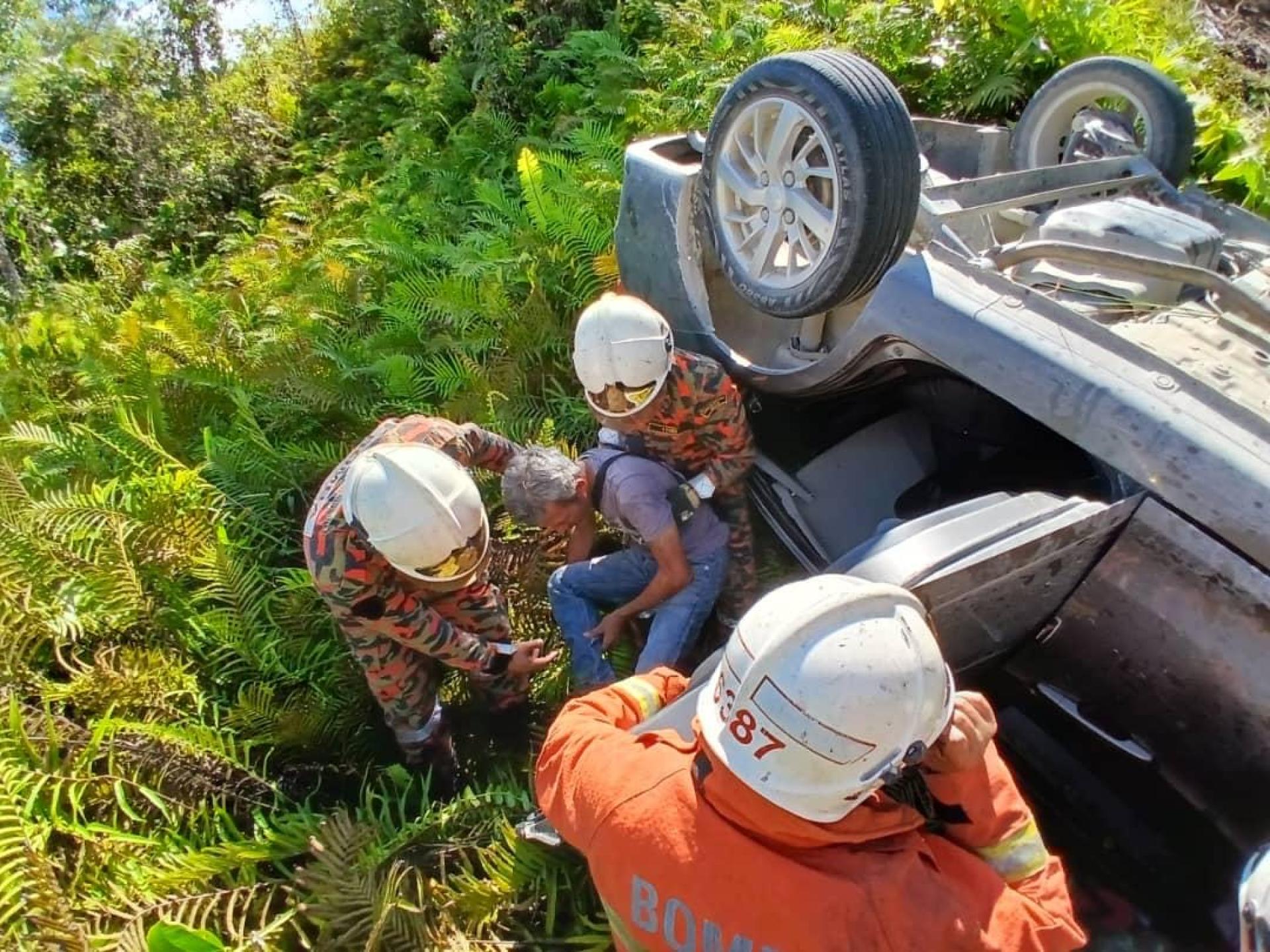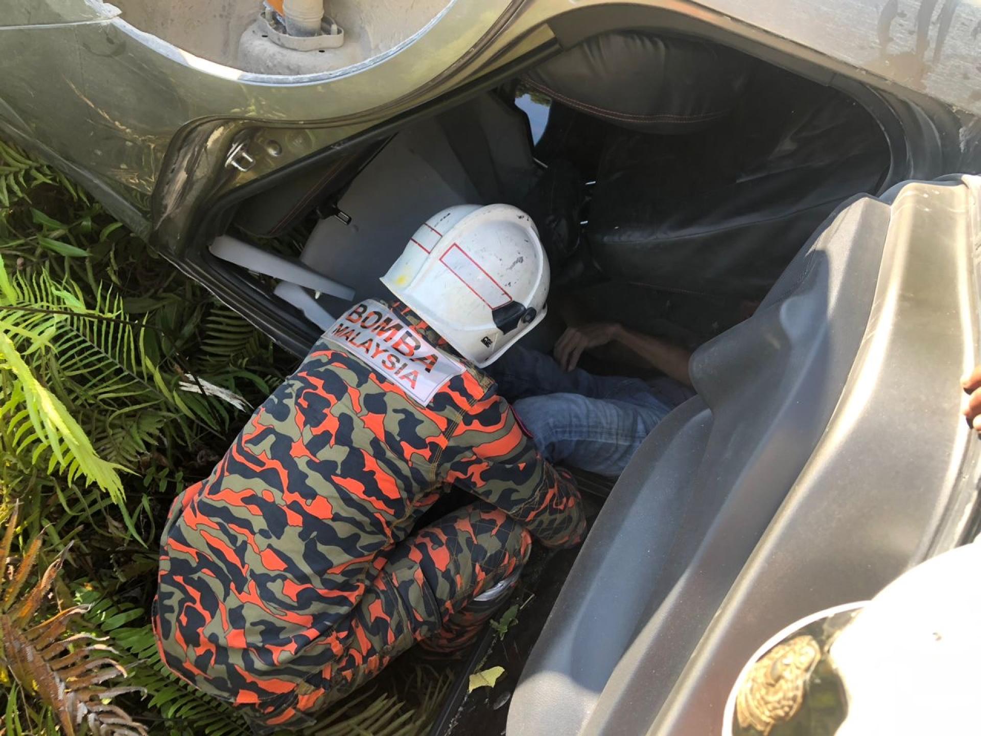 轿车坠15公尺山沟 两男险受困