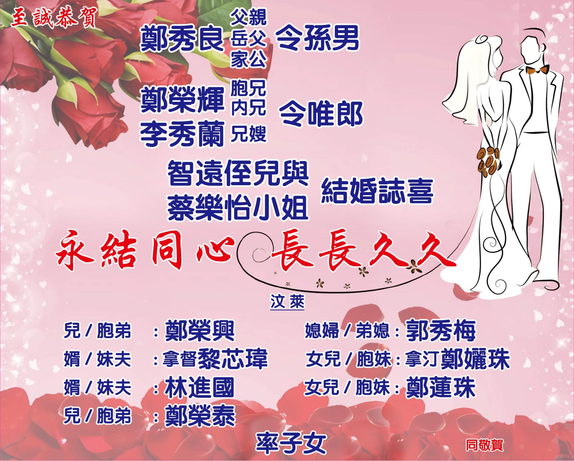 【贺词】賀鄭智遠先生与蔡樂怡小姐結婚誌喜