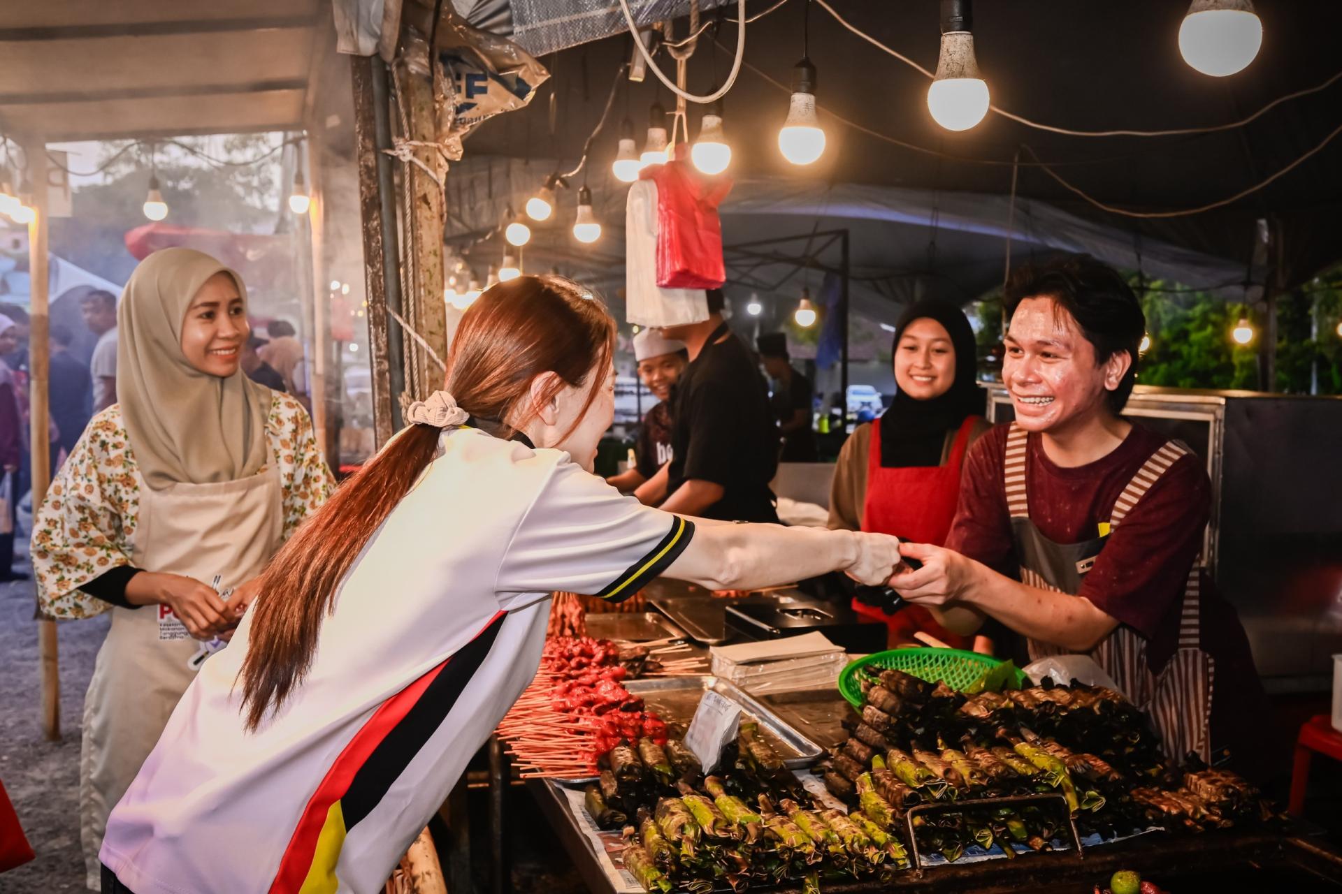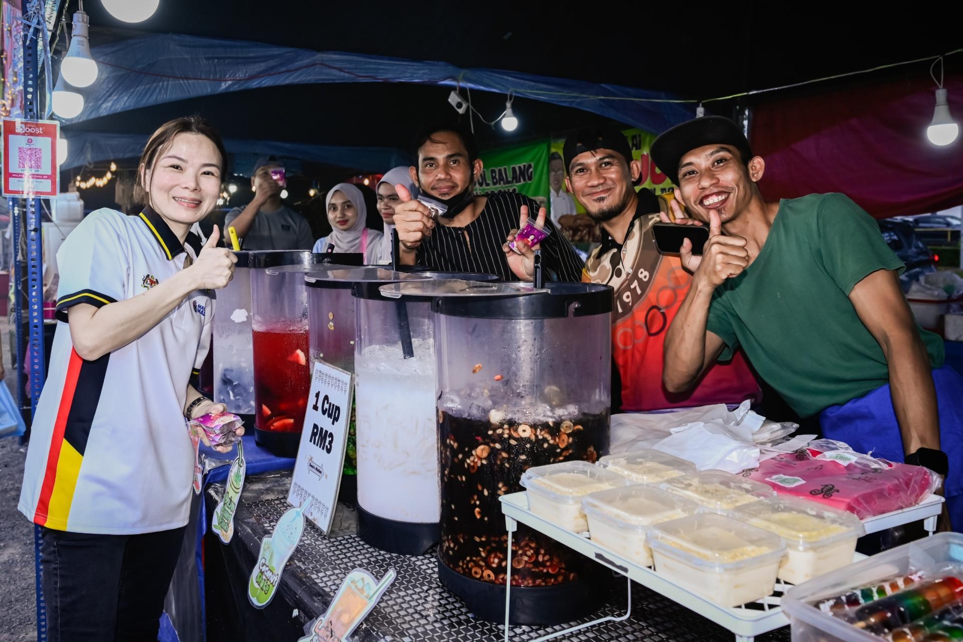 刘强燕与其助理们在抵达华利斋戒月市集后,就向每一个摊位分派椰枣,同时也分给在现场的民众。之后,刘强燕与其助理们前往城市广场第二期斋戒月市集,继续分派椰枣。