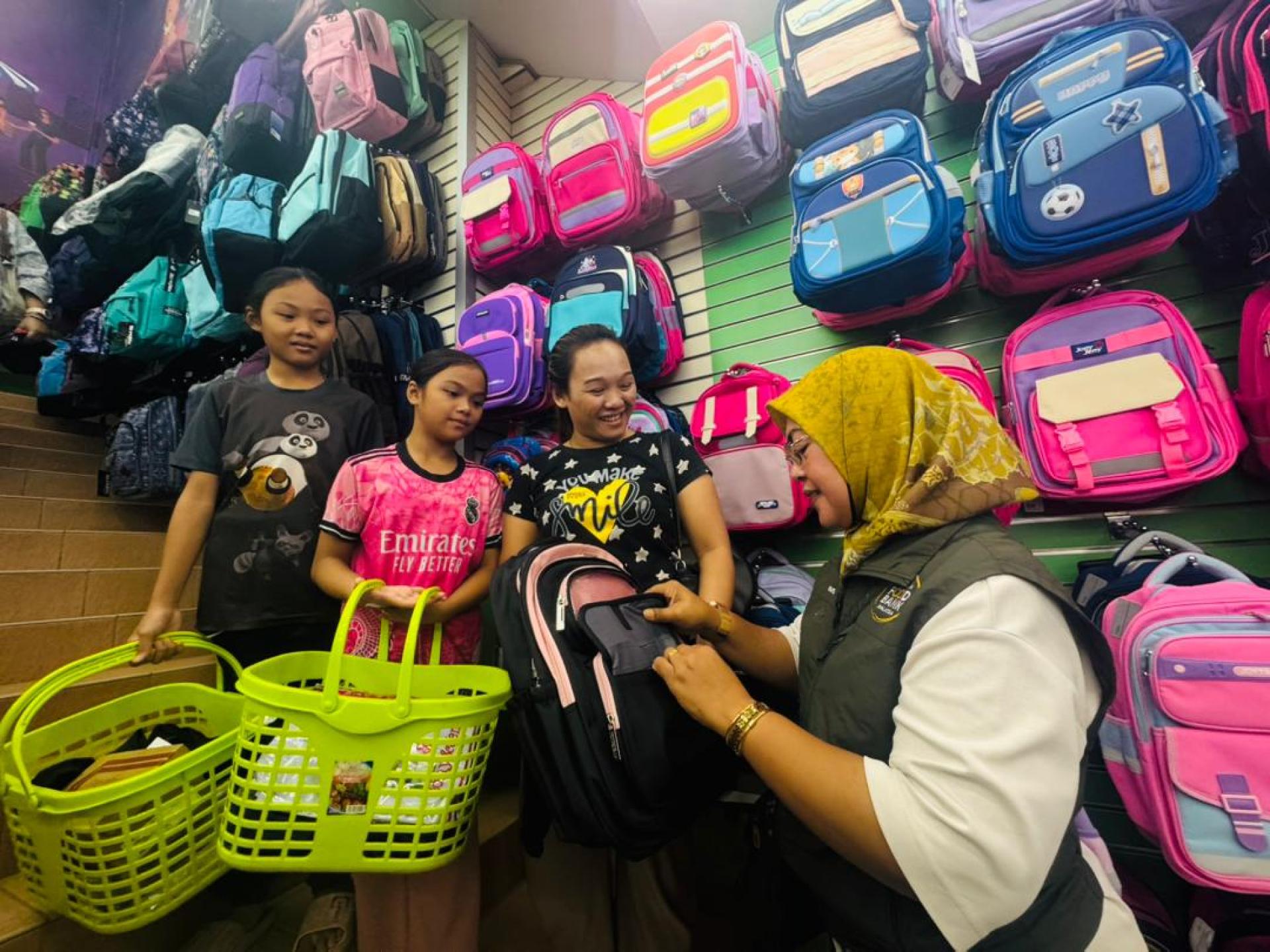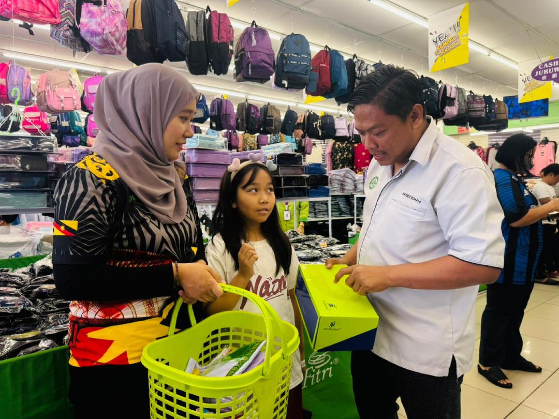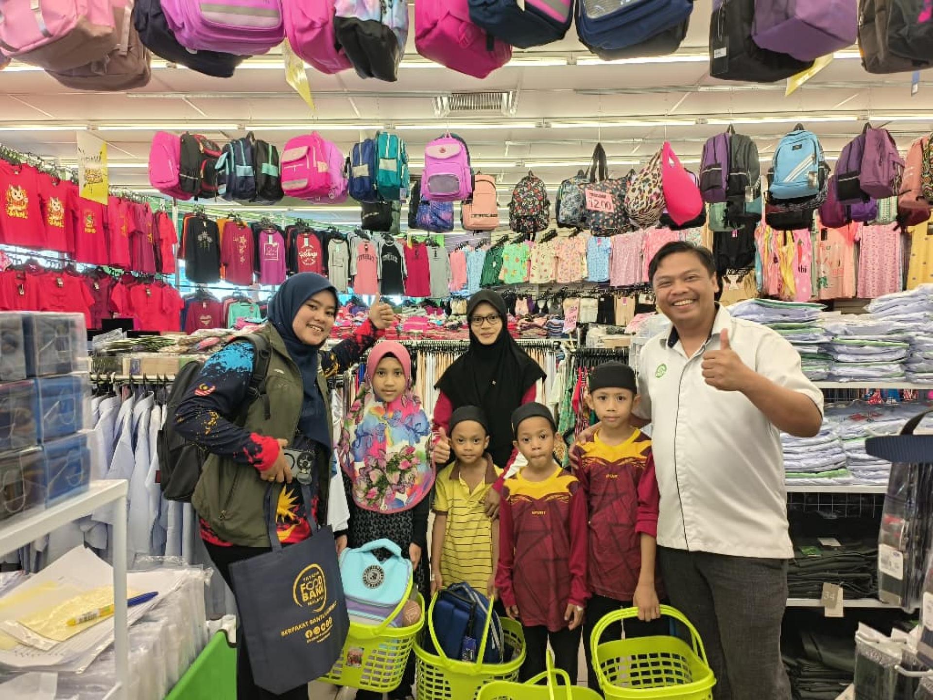 哈桑娜基金会、GDRN与马来西亚食物银行基金会向美里学生派发开学援助,购买上学用品。右为哈菲兹。