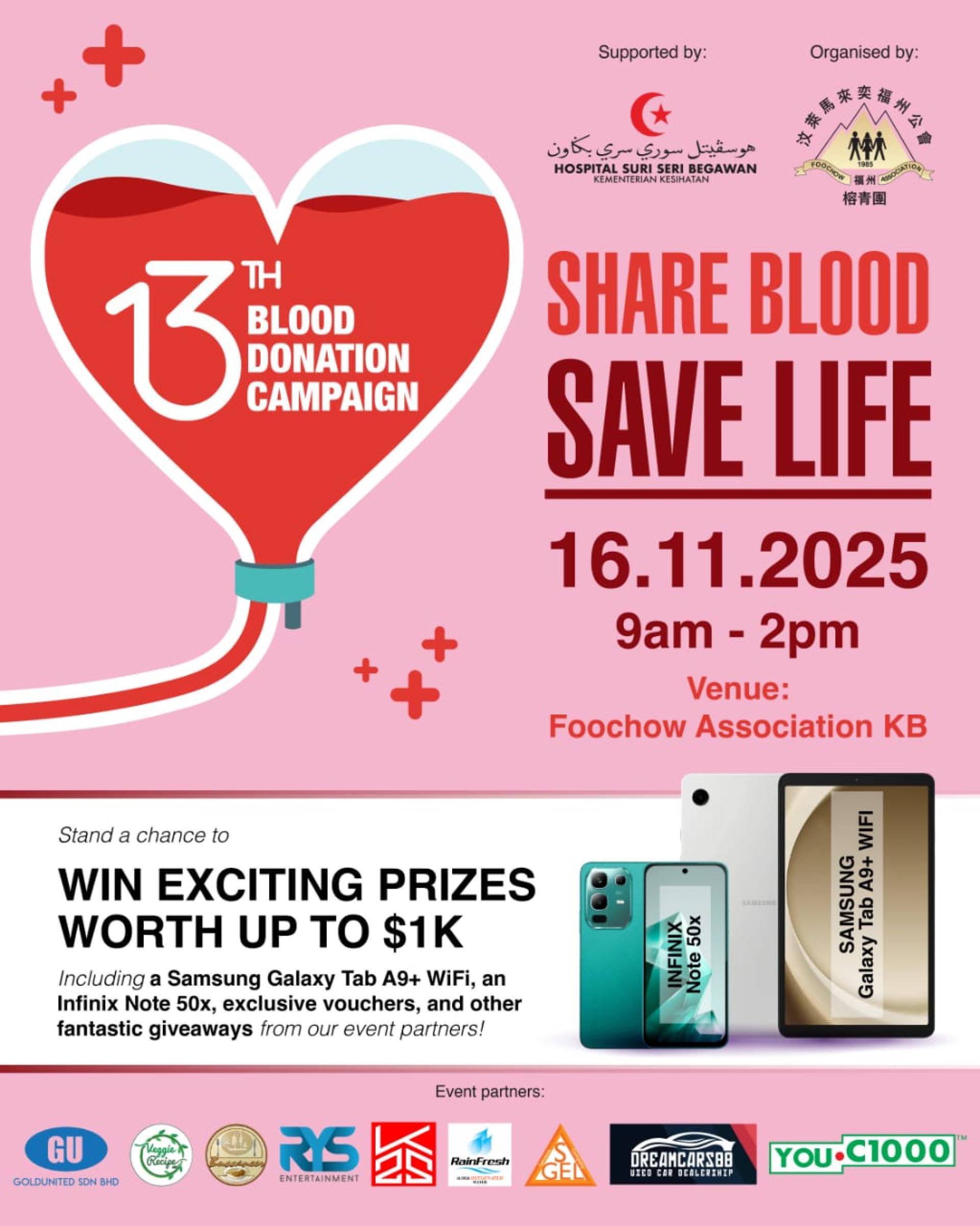 当天捐血者还有机会赢取总值高达汶币1,000元的丰富奖品,包括 Samsung Galaxy Tab A9+ WiFi 平板电脑、Infinix Note 50x 手机、购物礼券及其他精美礼品。