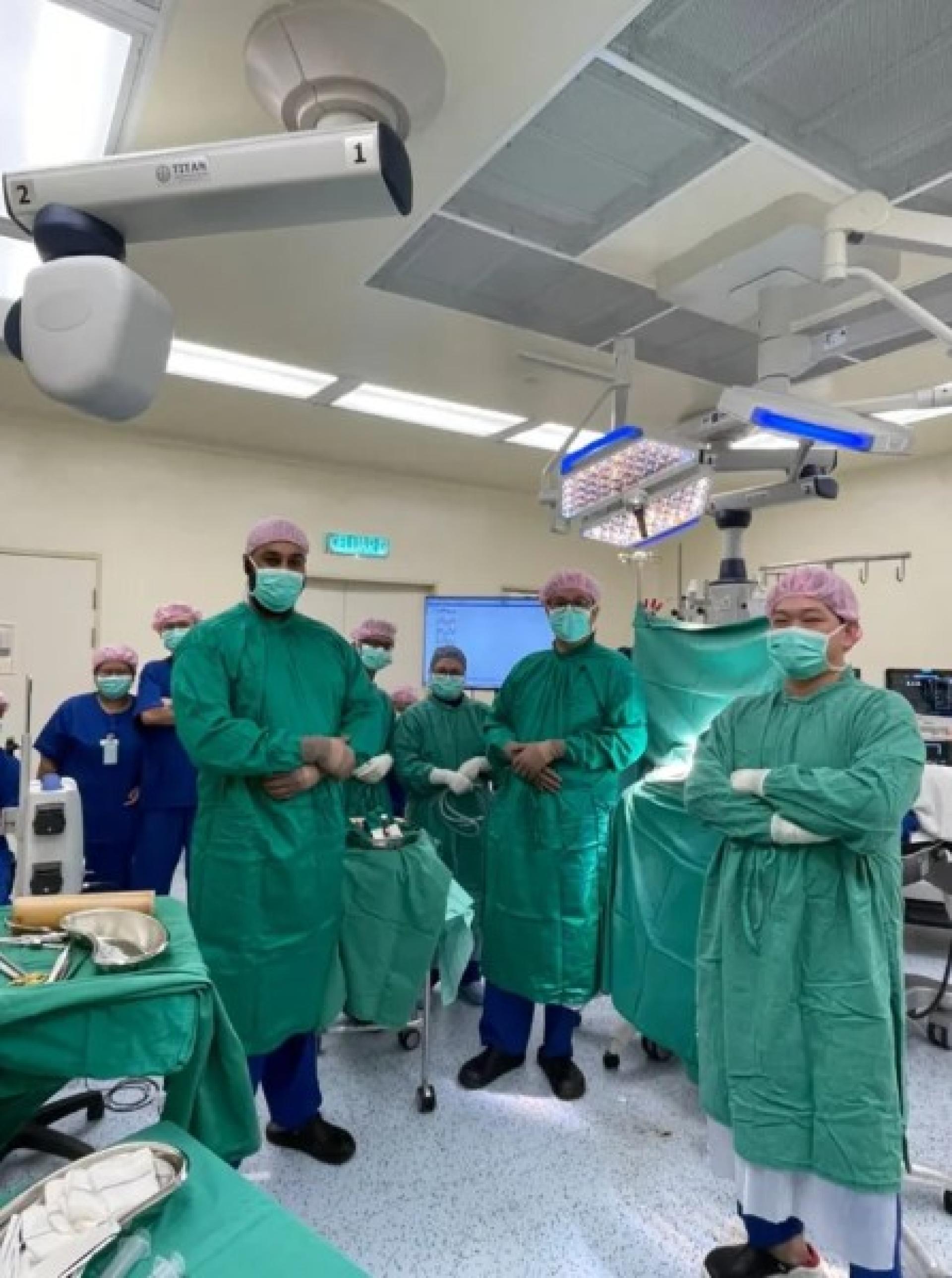 由Manvinder Singh Mangat与Lim Swee San领衔的多学科手术团队在美里医院手术室合影。