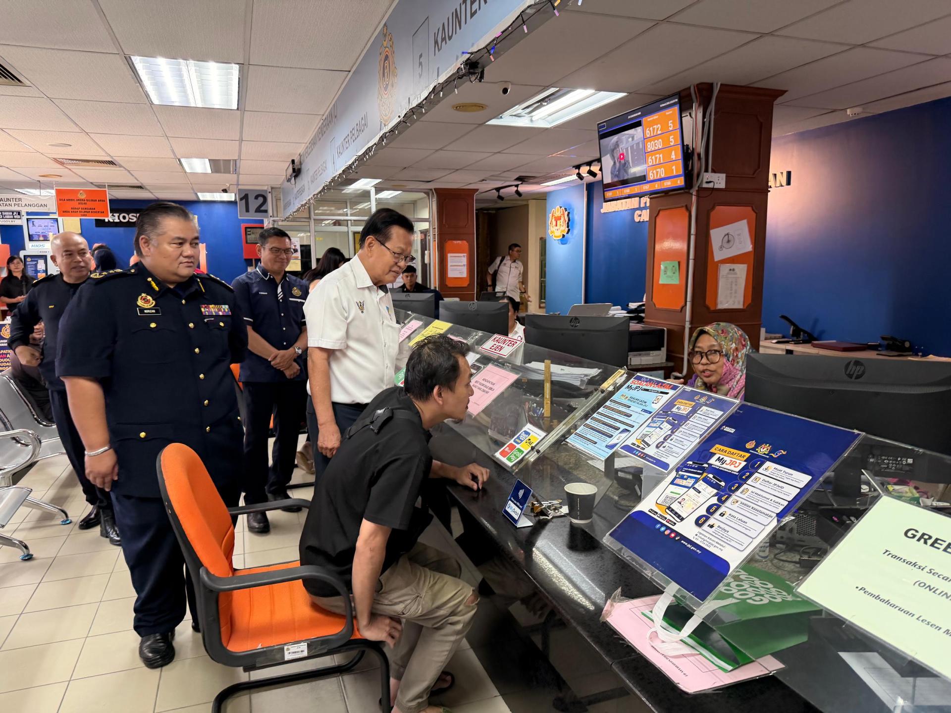 拿督斯里李景胜在砂陆路交通局总监诺里查吉利的陪同下参观美里陆路交通局服务柜台。