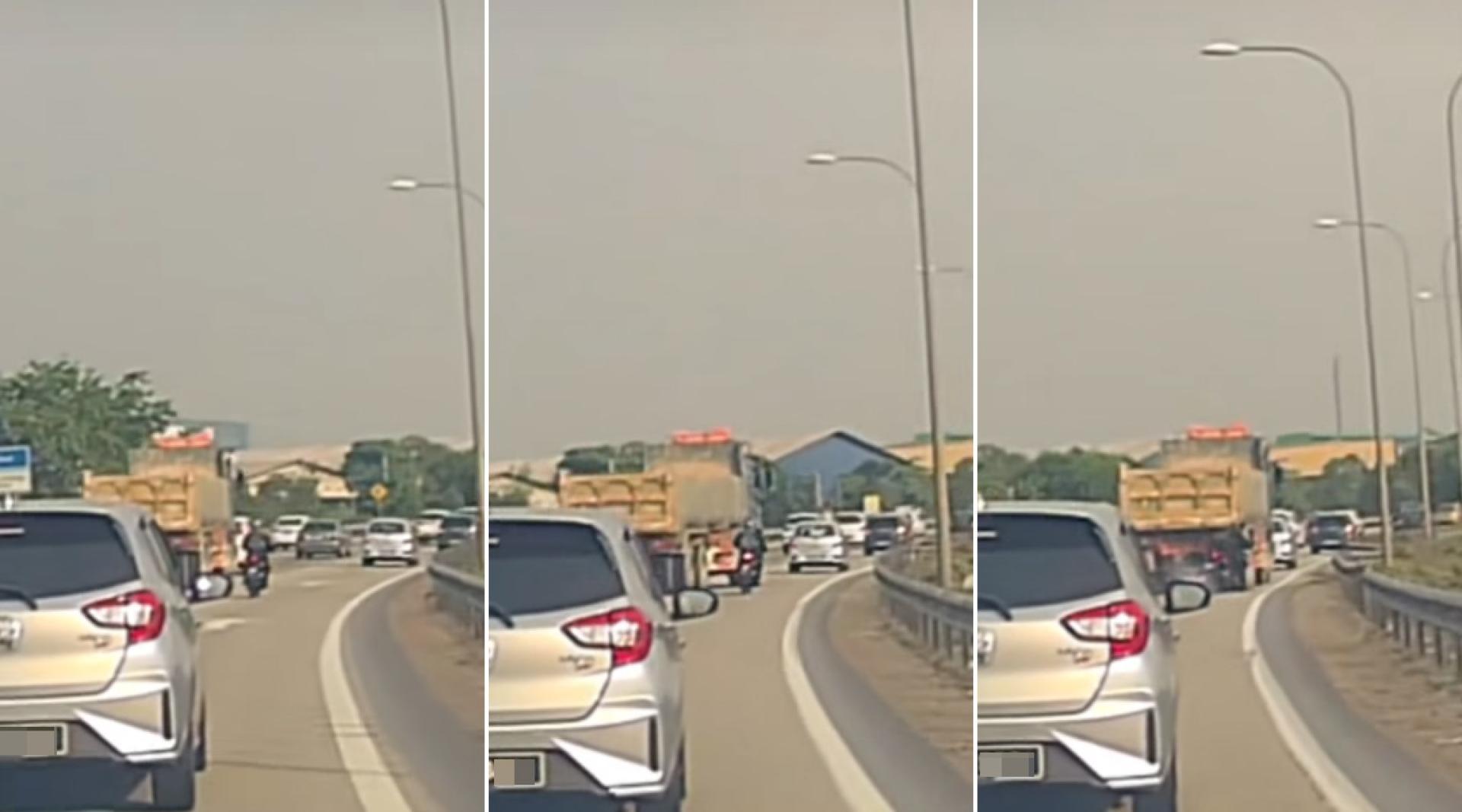 一段行车记录器视频近日在社交媒体疯传,引起网民热议,画面显示,一辆罗里从右侧车道行驶途中转向左边的车道,而尾随的摩托车骑士也切换车道转向右侧车道行驶。