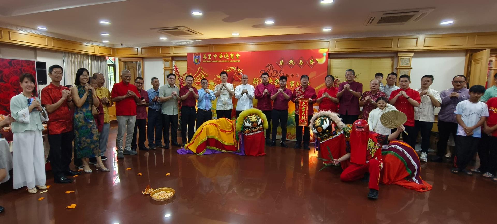 出席嘉宾包括美里区国会议员赵俊文代表邹梓健、美里市长俞小珊代表兼市议员范宏祥、美里华总会长许信隆、美里华人社区领袖天猛公杨惠生以及各社团领袖与闻人,齐聚一堂共庆新春。