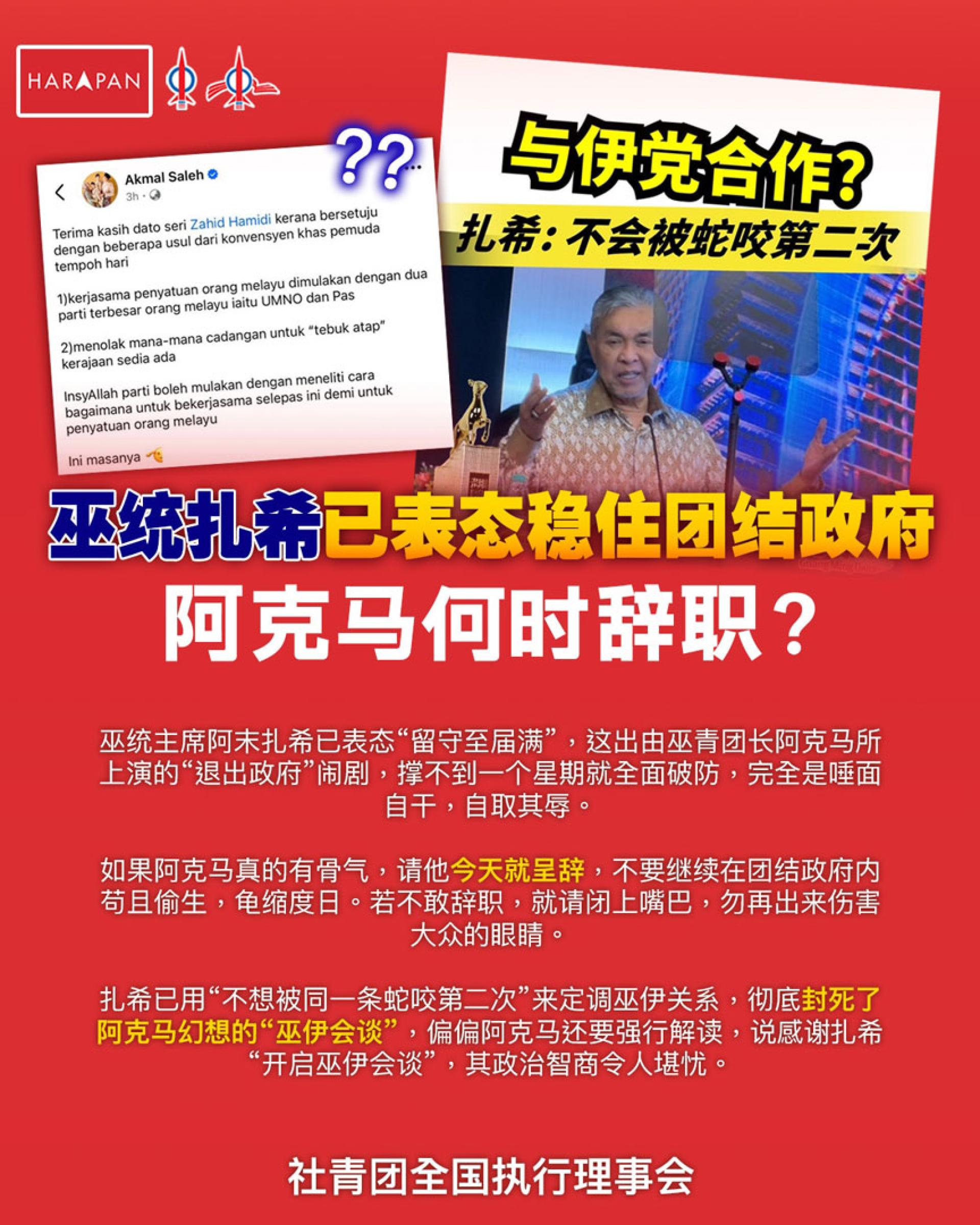 社青团更追问阿克马,如果真的有骨气,请他今天就呈辞,不要继续在团结政府内苟且偷生,龟缩度日。