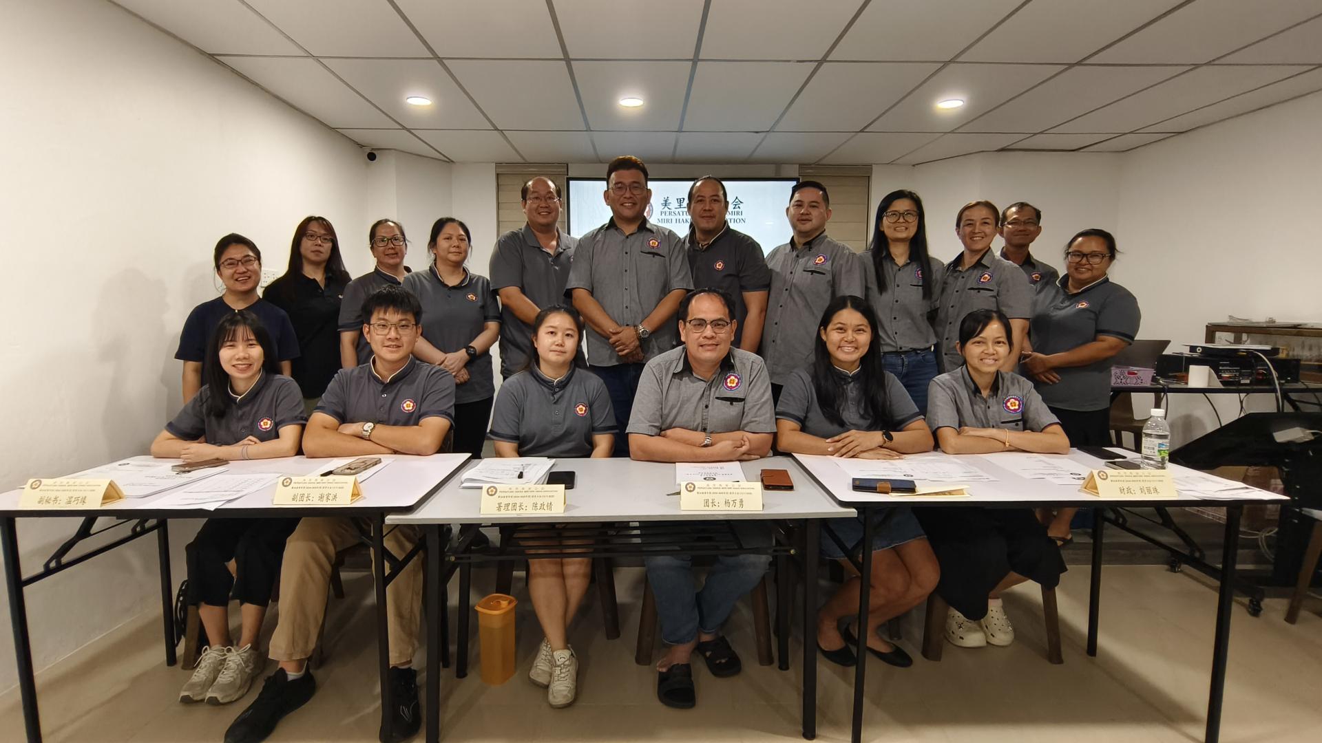 美里客家公会青年团主办2025年《传承书法》比赛筹备会成员合影。左4起为团长杨万勇及筹备委员会主席刘丽美。