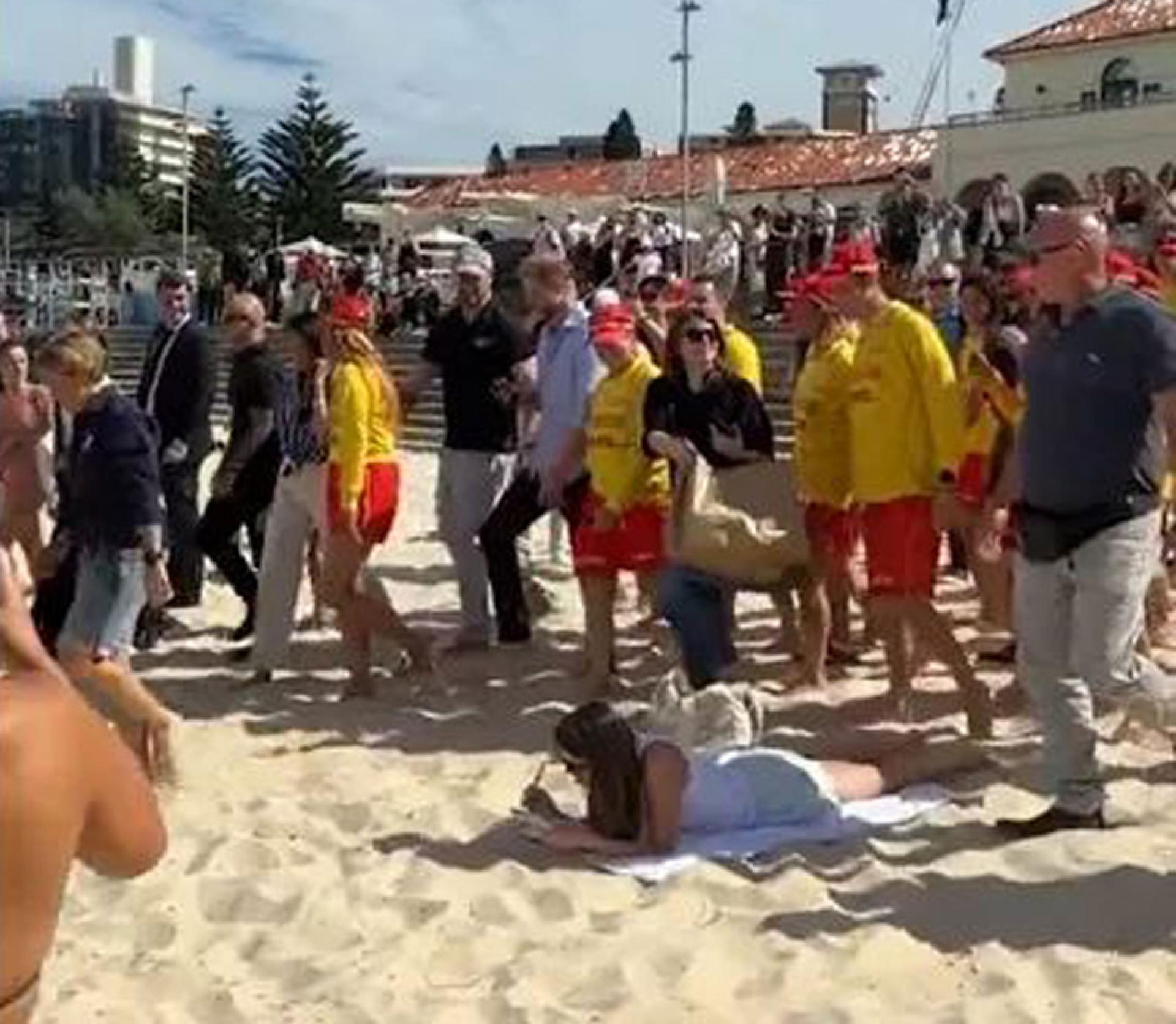 一段视频显示,当一行人沿海滩行走时,正好经过一名趴在毛巾上晒太阳的女子。面对周围的嘈杂和人群,她显得毫不在意,继续低头看书,没有起身让路,也没有对这对“贵宾”作出任何反应。