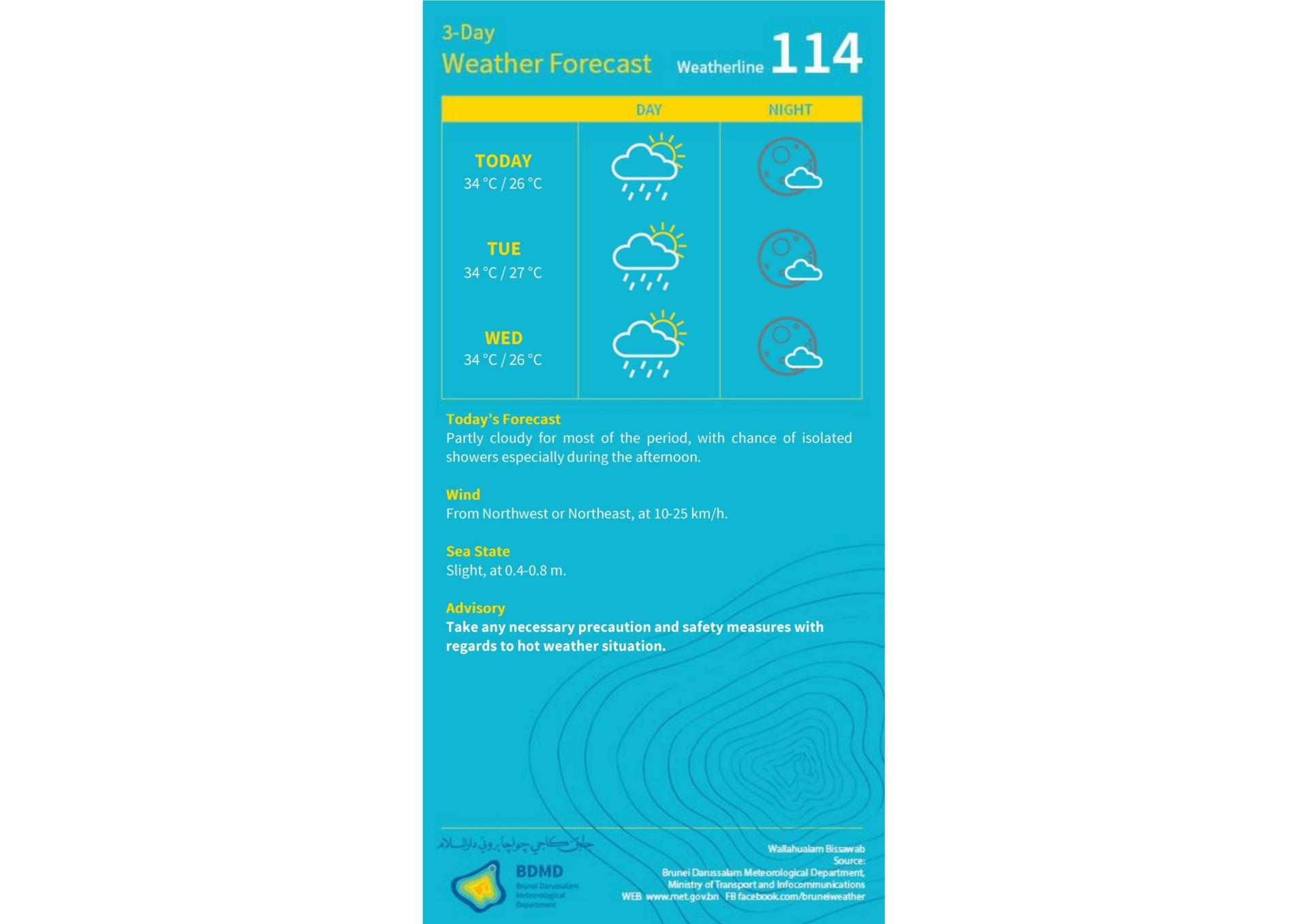 (斯市19日讯)汶莱气象局今日发布未来3天天气预报指出,全国大部分地区将持续炎热天气,白天以多云为主,局部地区尤其在下午时段可能出现短暂阵雨,公众受促做好防暑及安全防范措施。