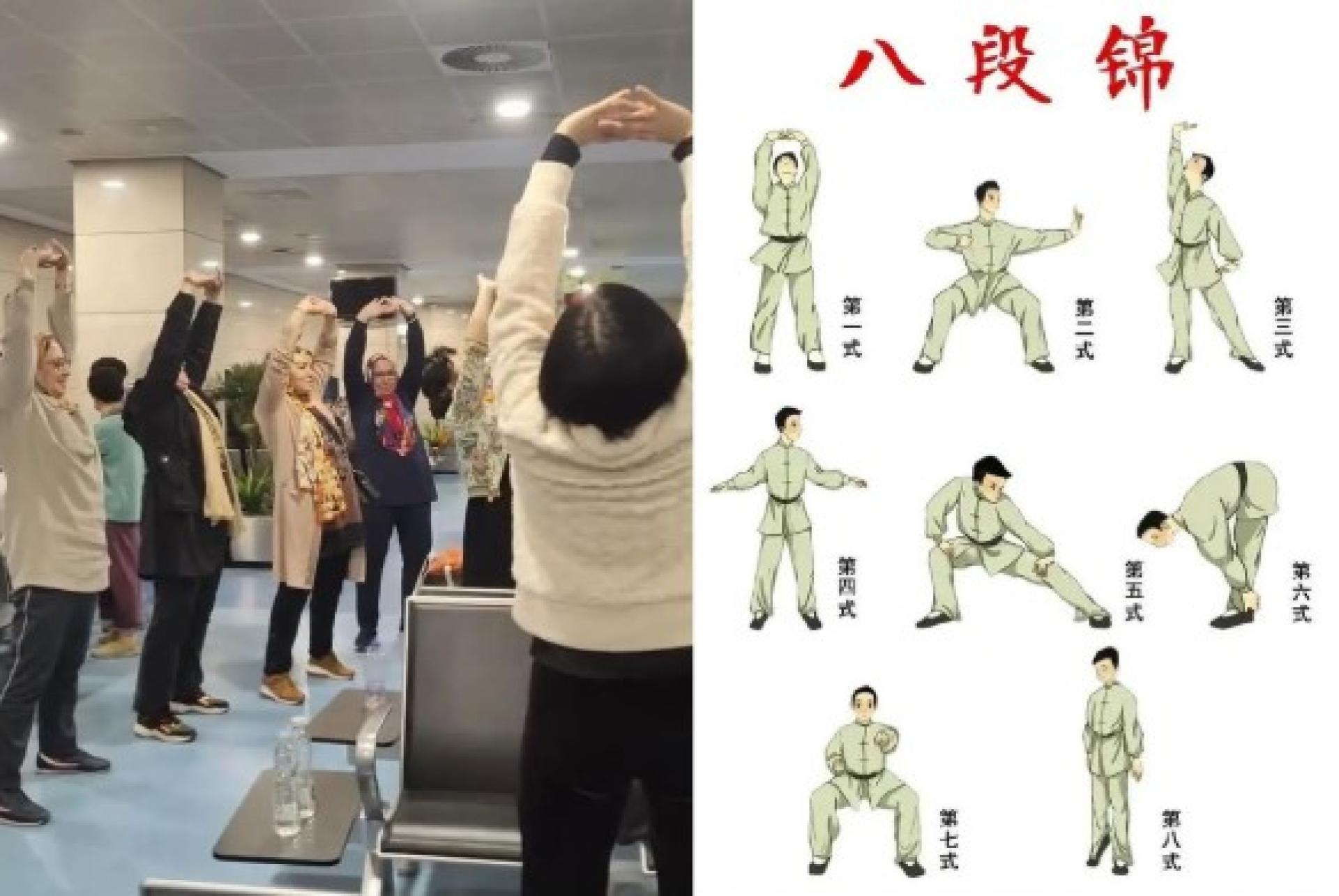 航班延誤 中國大媽練八段錦 外國人跟著練