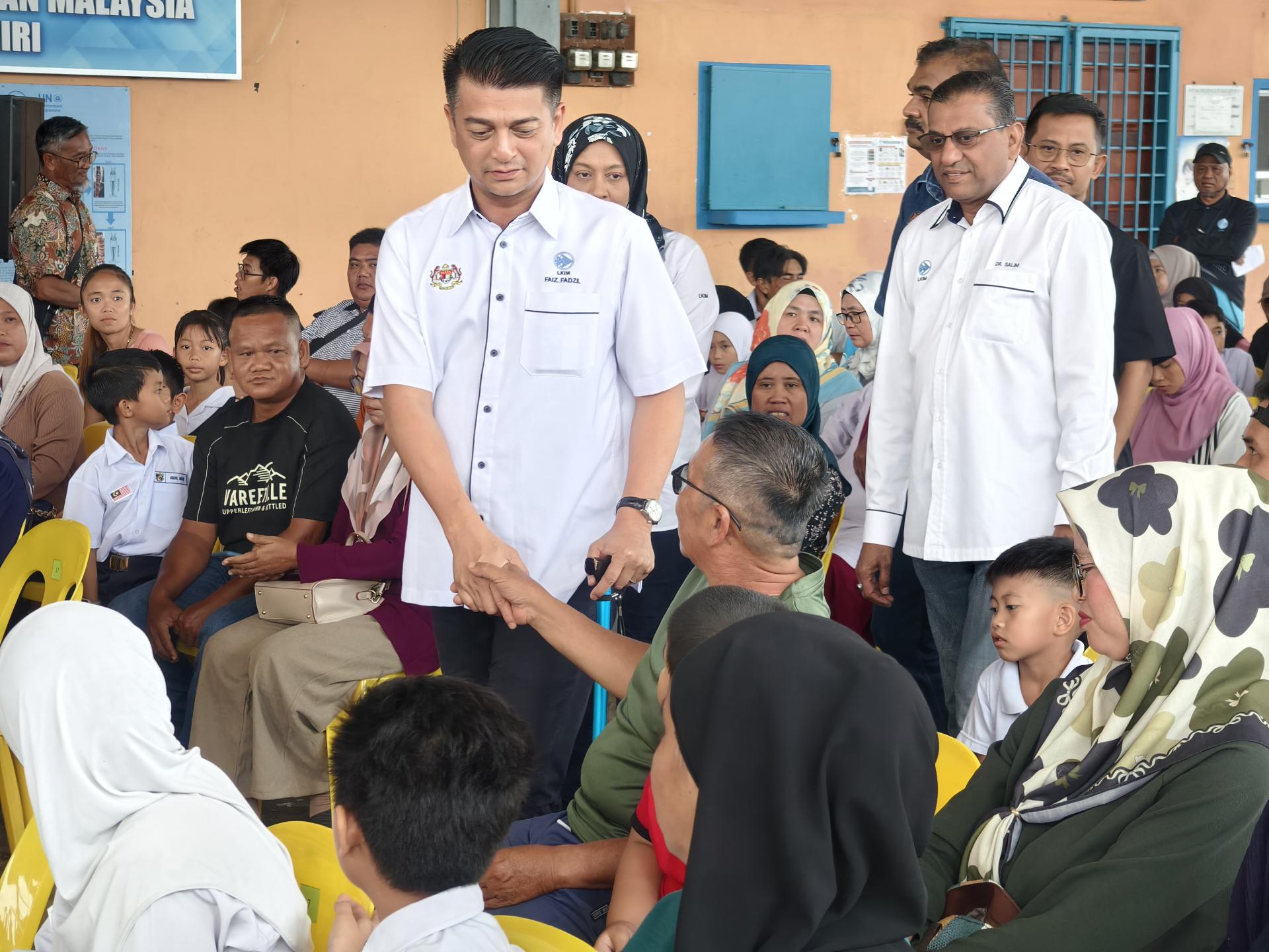 马来西亚渔业发展局主席法依兹法兹出席美里的渔民子女返校活动,与渔民握手问好。