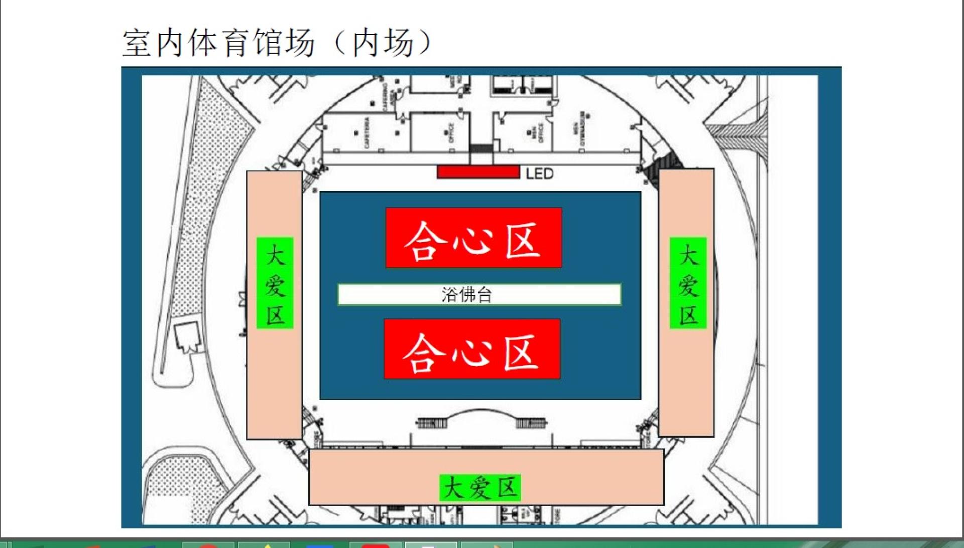 为照顾不同群体的需求,会场进行了精心规划,即合心区(中间球场)由1000人排列出庄严图形进行浴佛;大爱区(三面看台),设有1500个座位,专供年长者、幼童及不宜久站的民众参与。