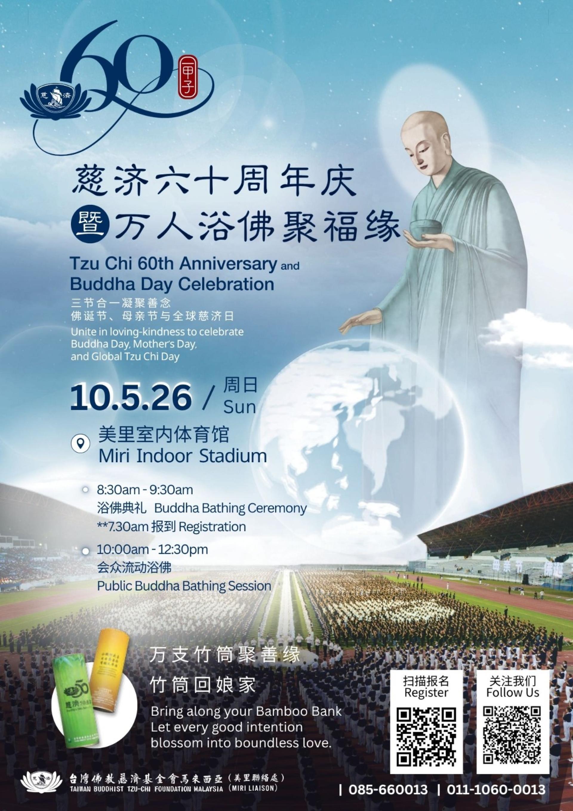 (美里23日讯)台湾佛教慈济基金会马来西亚美里联络处,配合慈济创办60周年,将于5月10日(星期日),上午7时至中午12时30分,在美里室内体育馆举行“慈济60周年庆暨佛诞日、母亲节、慈济日”三节合一浴佛典礼。