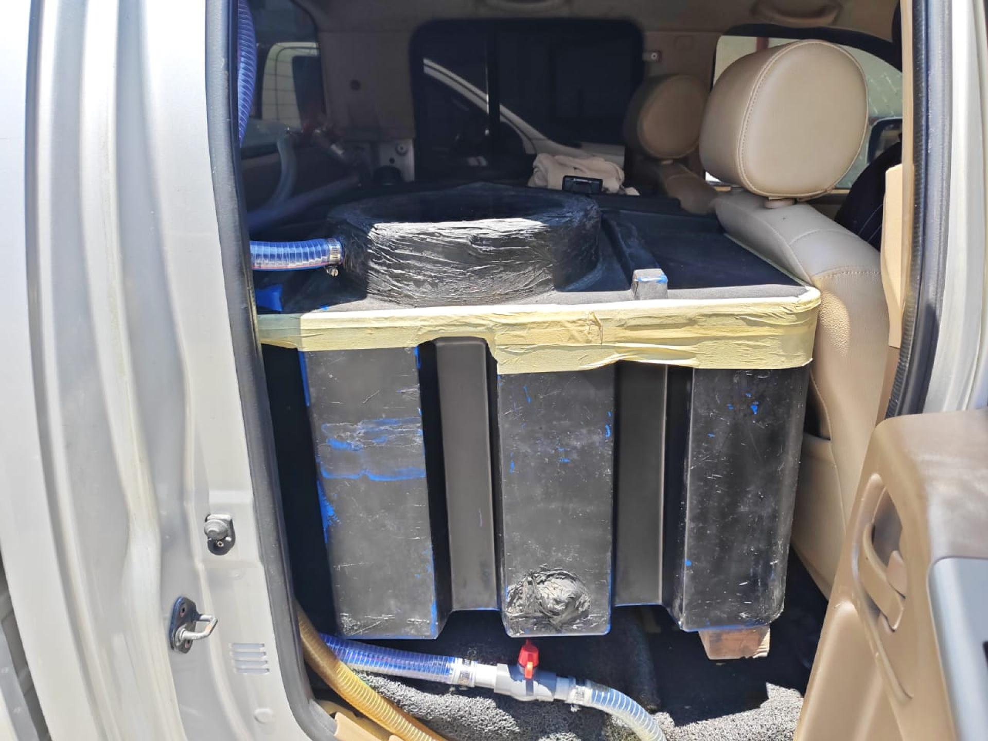 执法人员在行动中对一辆可疑私家车进行初步检查,发现该车辆正在加注受管制柴油。随后,执法队伍在车内发现一个帆布储油袋及多个经改装的塑料桶,相信是用于储存及转运柴油之用。