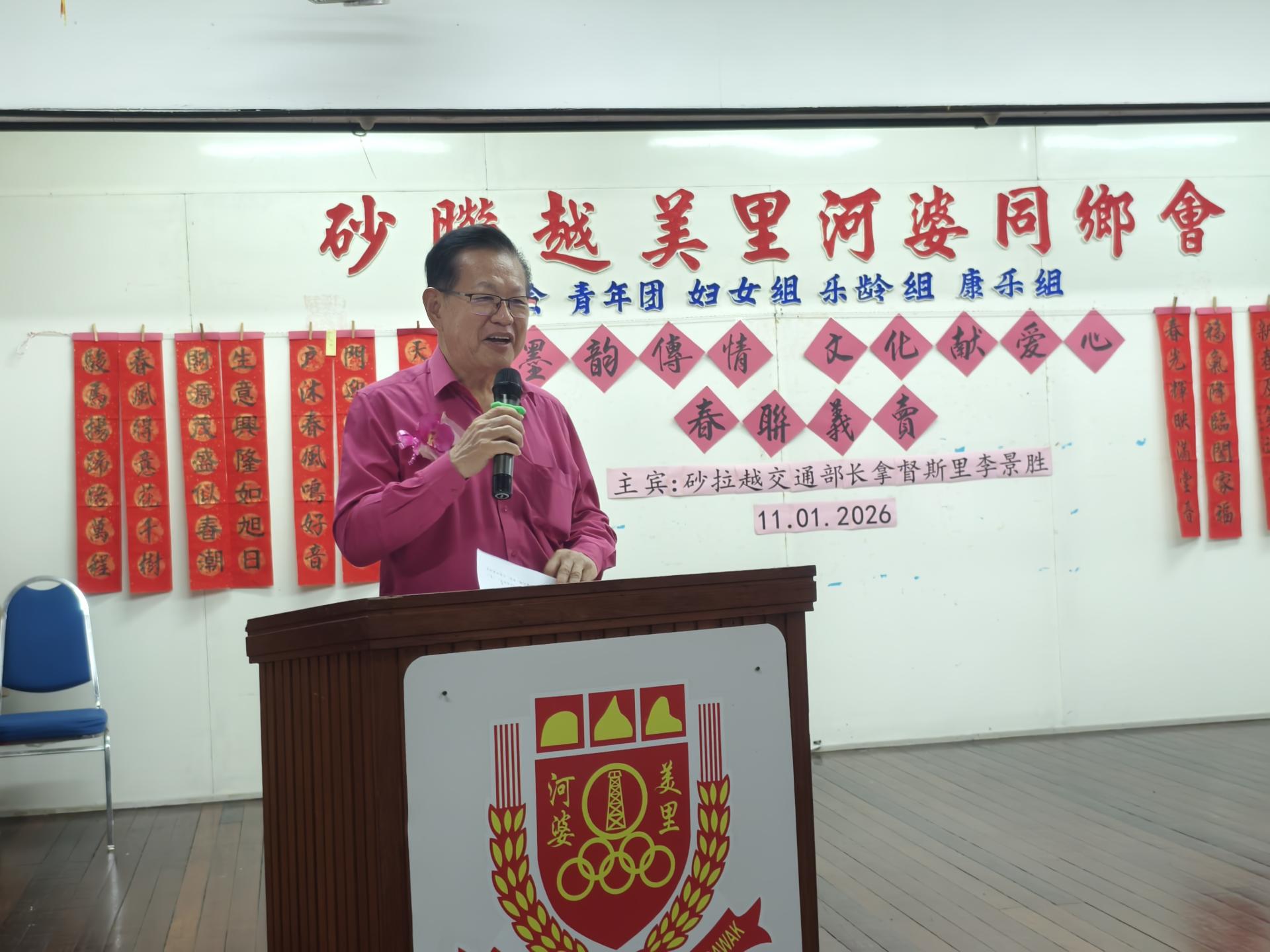 他感谢美里河婆同乡会长期推动文化、关怀乐龄及参与公益活动,并祝愿活动圆满成功,大家平安迎接马年。