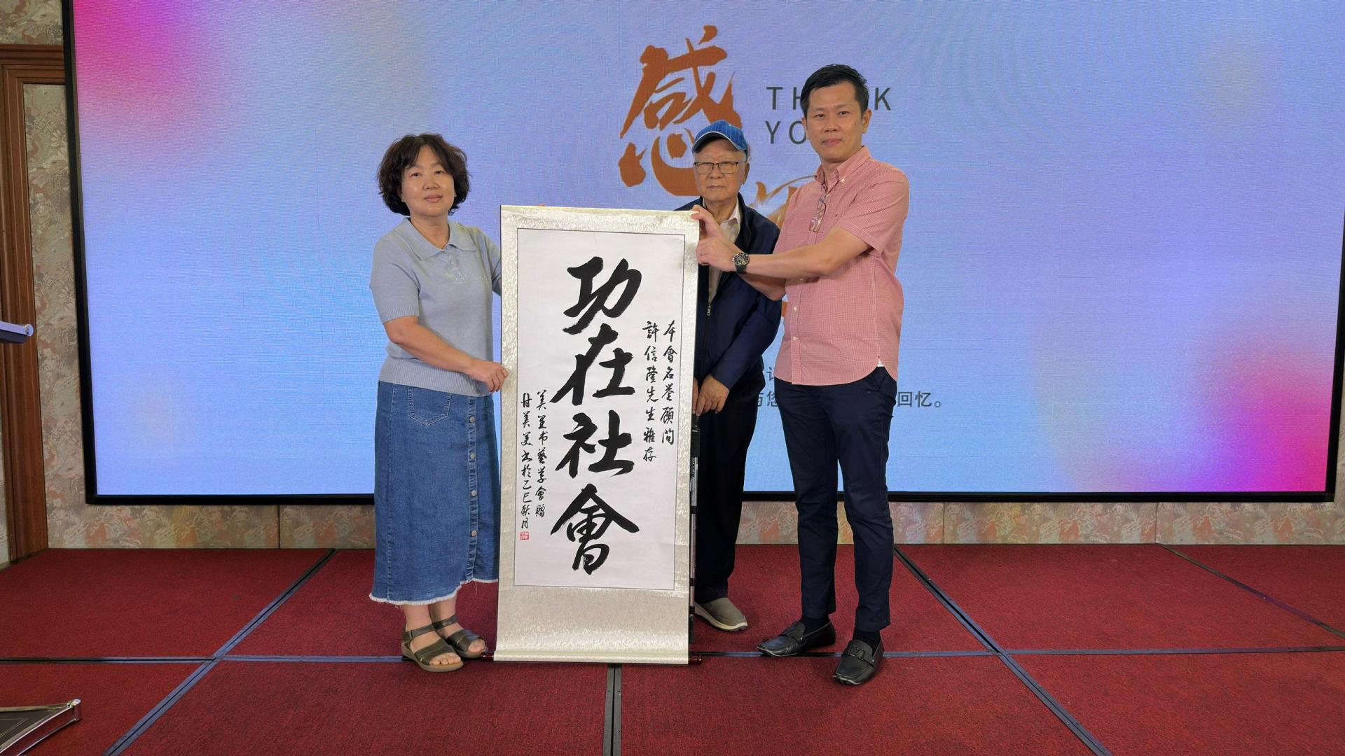 美里书艺学会也在会上赠送由主席甘美美(左)所写的墨宝予许信隆。中为陈乃豪。
