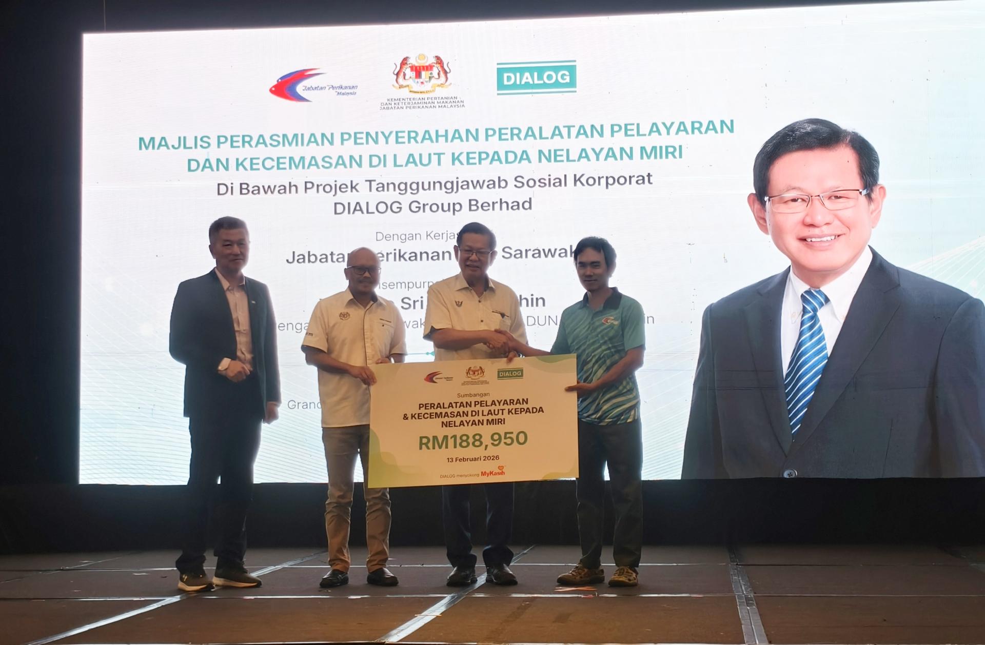 “这片广袤的海洋由各方共享,包括传统渔民、商业渔民以及石油天然气行业、航运业等从业者。这片广袤的海洋已成为许多人的希望之地和生计来源。” 他强调,随着地震勘测、平台建设及营运等大型项目推进,企业投入巨额资本带动经济与就业机会,但同时也应通过企业社会责任(CSR)回馈基层群体,确保发展成果惠及社会各阶层。 Dialog Group Berhad向美里渔业社区80名渔民捐赠总值18万8950令吉的个人定位信标(PLB)紧急设备及GPS导航设备,由拿督斯里李景胜(左3)主持移交仪式。左起为包久怀,拉赫曼瓦哈。“DIALOG集团有限公司的这项捐助体现其企业社会责任(CSR)精神,反映这家石油和天然气行业实体对砂拉越渔业社区安全和福祉的高度关注。” 李景胜对80名来自甘榜马吉(Kampung Masjid)、瓜拉峇南甘榜峇都沙都、甘榜慕希巴与甘榜罗东的渔民获赠个人定位信标(PLB)表示肯定,认为此举体现油气企业对渔民安全的高度关怀。他呼吁更多企业与非政府组织加入CSR行列,共同提升渔民海上作业的安全保障。