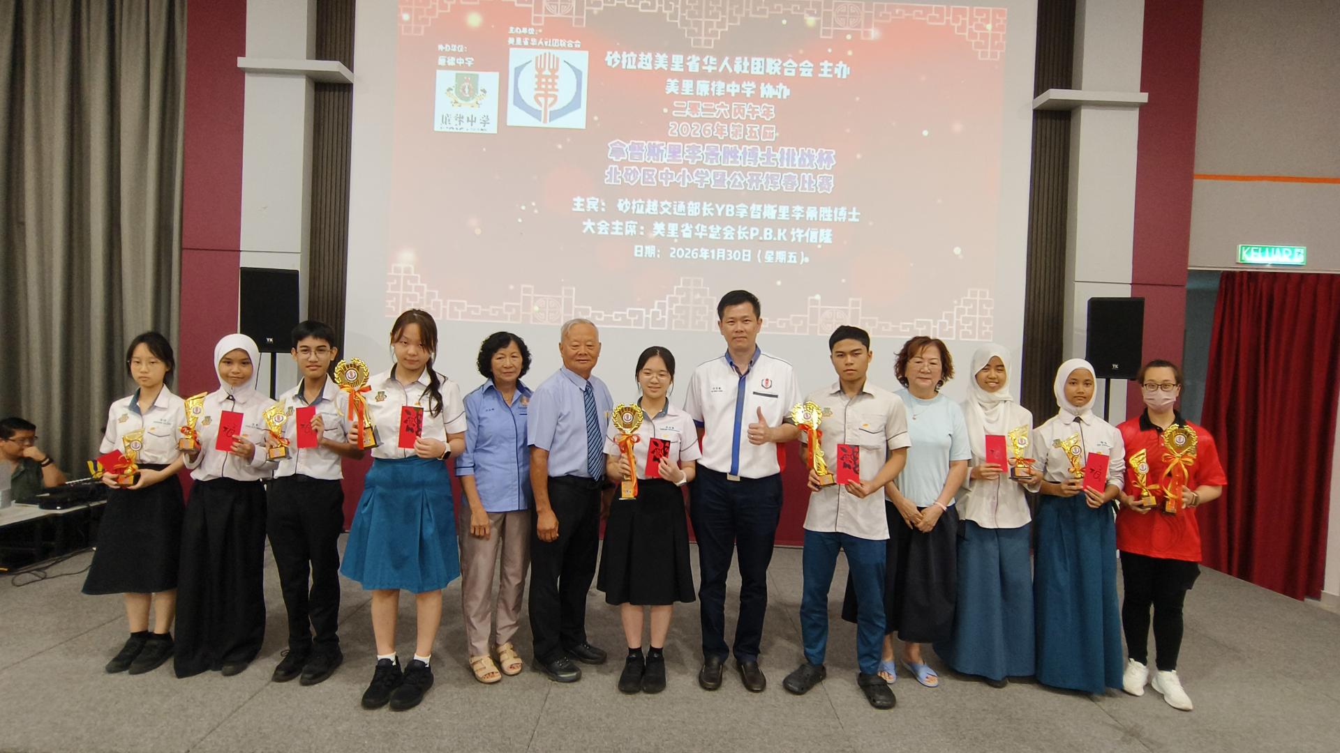初中组全体得奖者与颁奖嘉宾合影。 他表示,书法源自中华文化“琴、棋、书、画”四艺之一,不仅是文字书写的艺术,更有助于学生学习专注、培养审美情趣及沉淀内在修养。这也是拿督斯里李景胜多年来持续支持挥春比赛的深远意义所在,即让文化成为教育的一部分,让艺术滋养学生成长。
