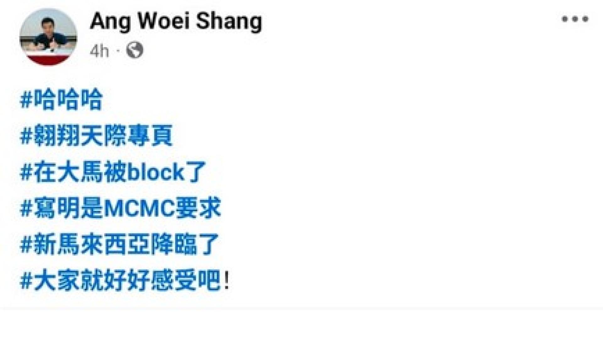 根据媒体报导,洪伟翔透露,他是在今午收到上百名粉丝讯息后,才得知其专页无法在本地浏览。他说,虽然仍保有专页使用权,但目前大马网民无法直接观看,部分粉丝需透过VPN才能浏览。