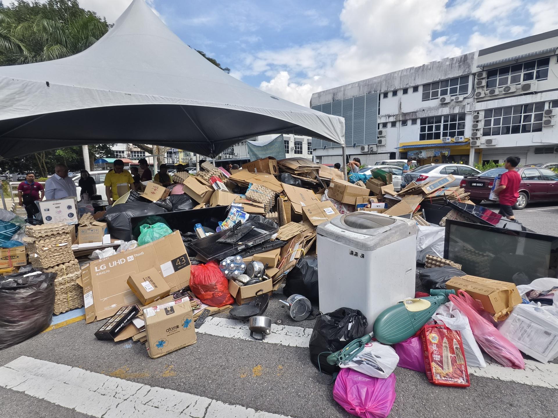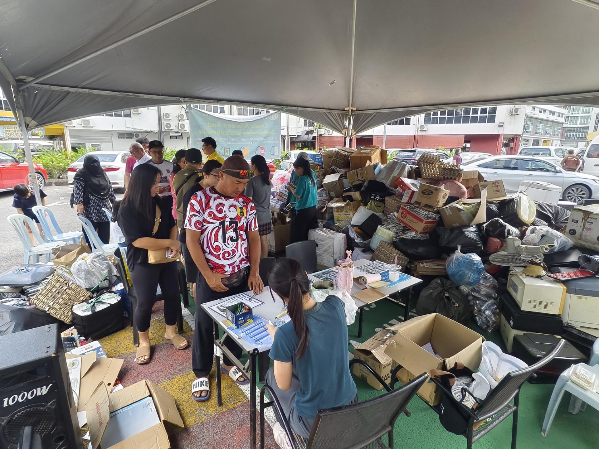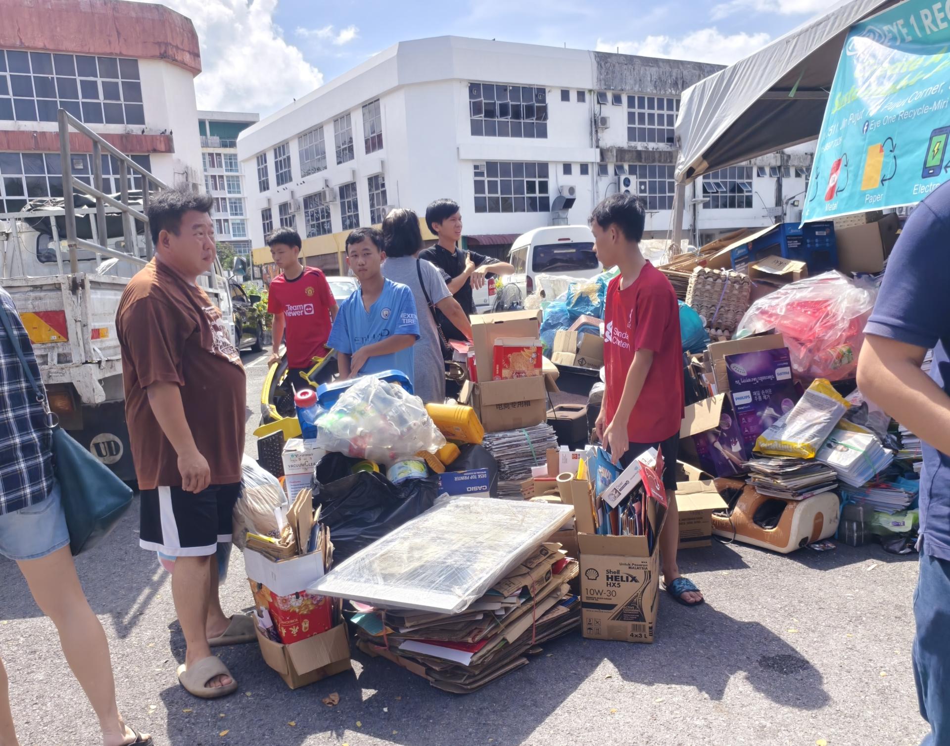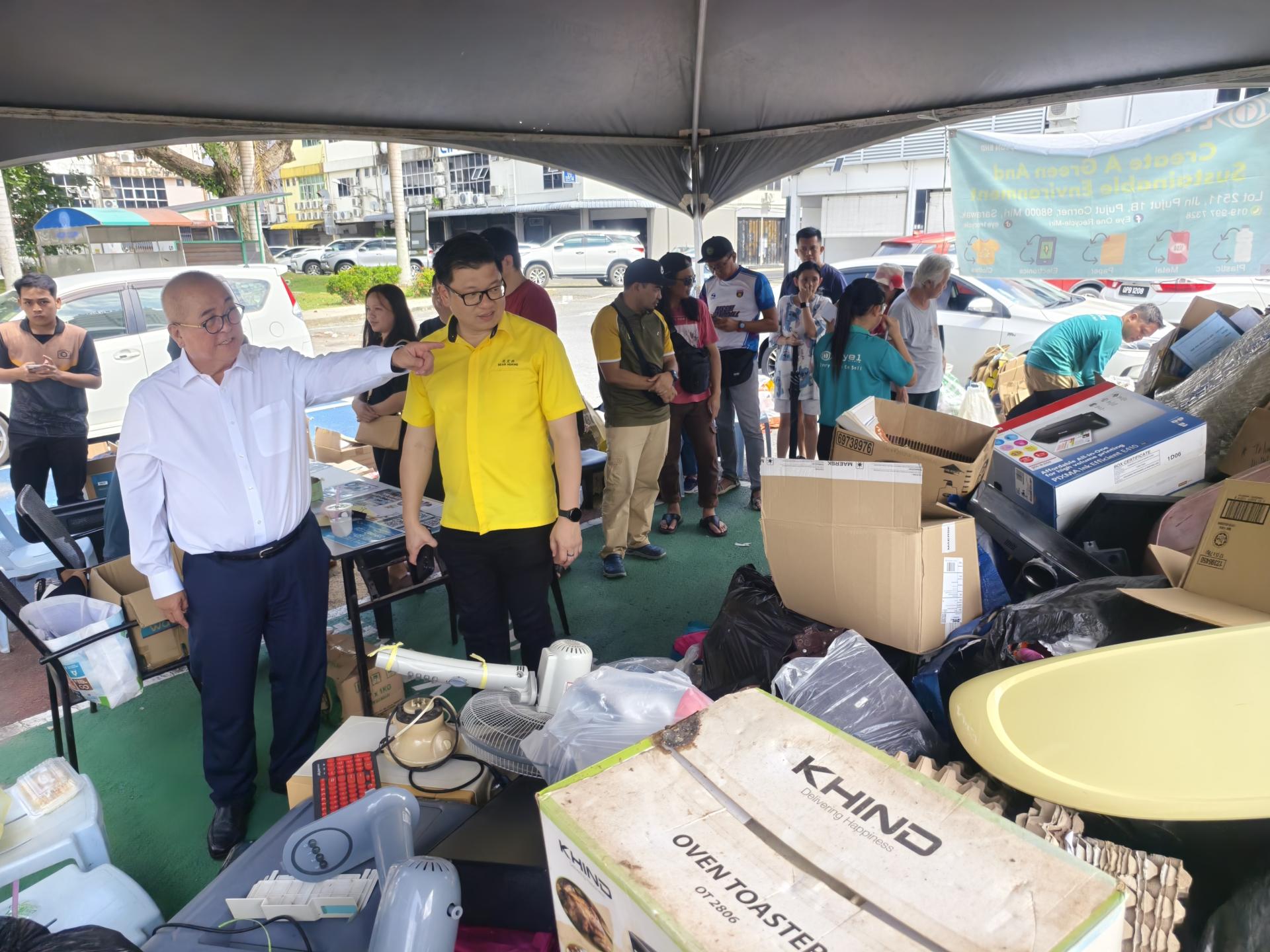 俞小珊今午前往美里市政局在美里雅京商业中心后方的美里绿色社区中心(Miri Green Community Hub),出席由市政局举办的“回收再购买”活动时,接受媒体访问指出,该活动获得市民热烈响应。自今早8时展开以来,不少民众携带报纸、纸箱、旧电器、金属及废铁等可回收物前来参与。 左起为美里市长俞小珊与美里市议员范宏祥巡视美里绿色社区中心“回收再购买”活动现场。 他透露,截至下午2时,现场已回收超过100公斤旧电器,各类纸张等回收重量预计已接近200公斤。