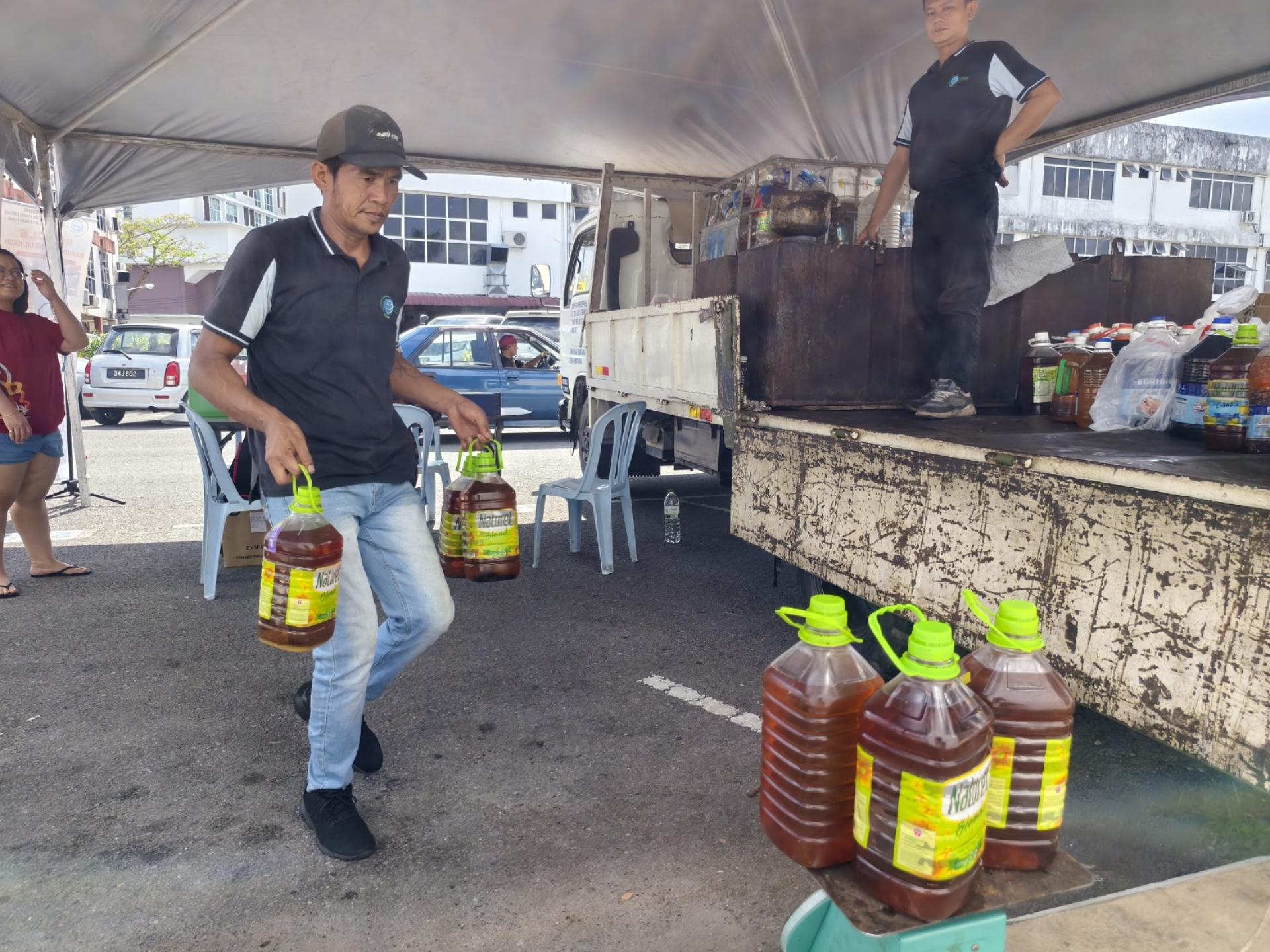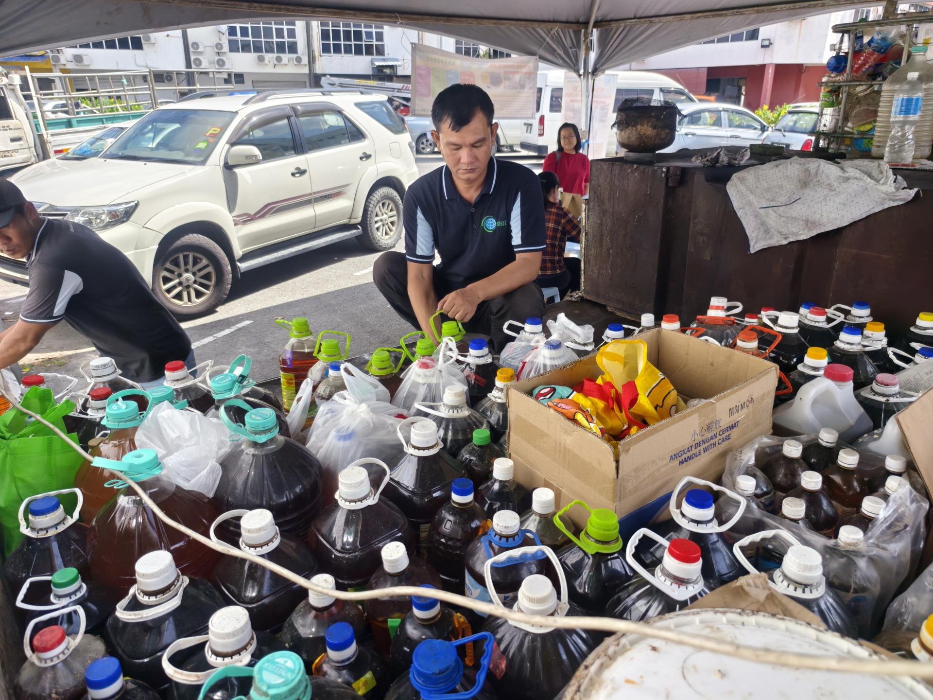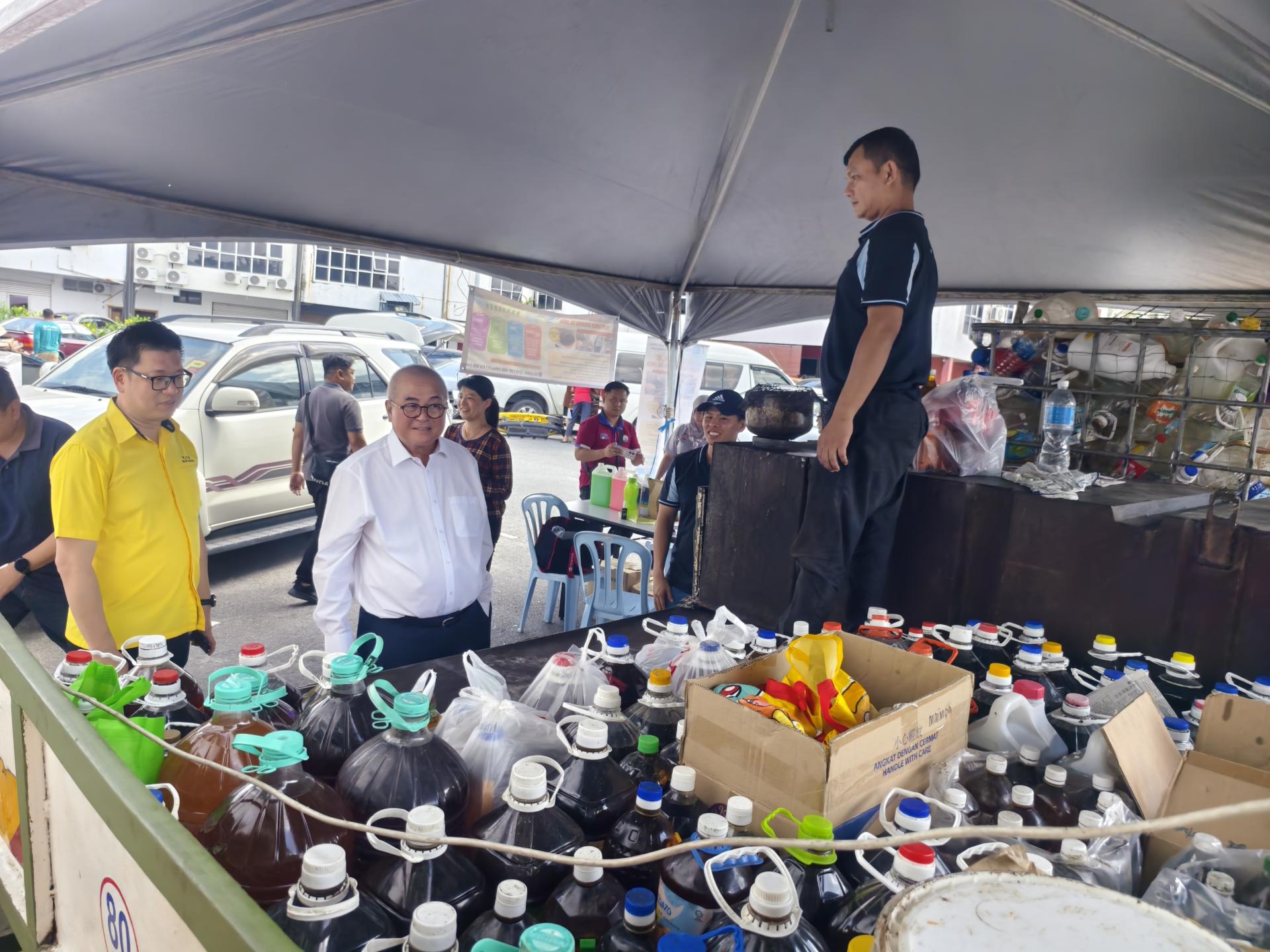 俞小珊指出,有关活动由市政局合作伙伴Eye 1 Recycle负责处理一般可回收物,而另一合作单位Sekitar Bumi Hijau则专门回收废弃食用油。根据现场负责人反映,废弃食用油自今早起已收集超过800公斤,显示市民环保回收意识逐步提高。 俞小珊(左2)巡视美里绿色社区中心“回收再购买”活动现场,了解废弃食用油的回收情况,鼓励市民积极参与环保行动。左为范宏祥市议员。他补充,废弃食用油每公斤可换取约2令吉50仙,鼓励市民将用过的食油收集后出售,取代随意倒入排水沟的做法,以免对环境造成污染,同时还能增加额外收入。
