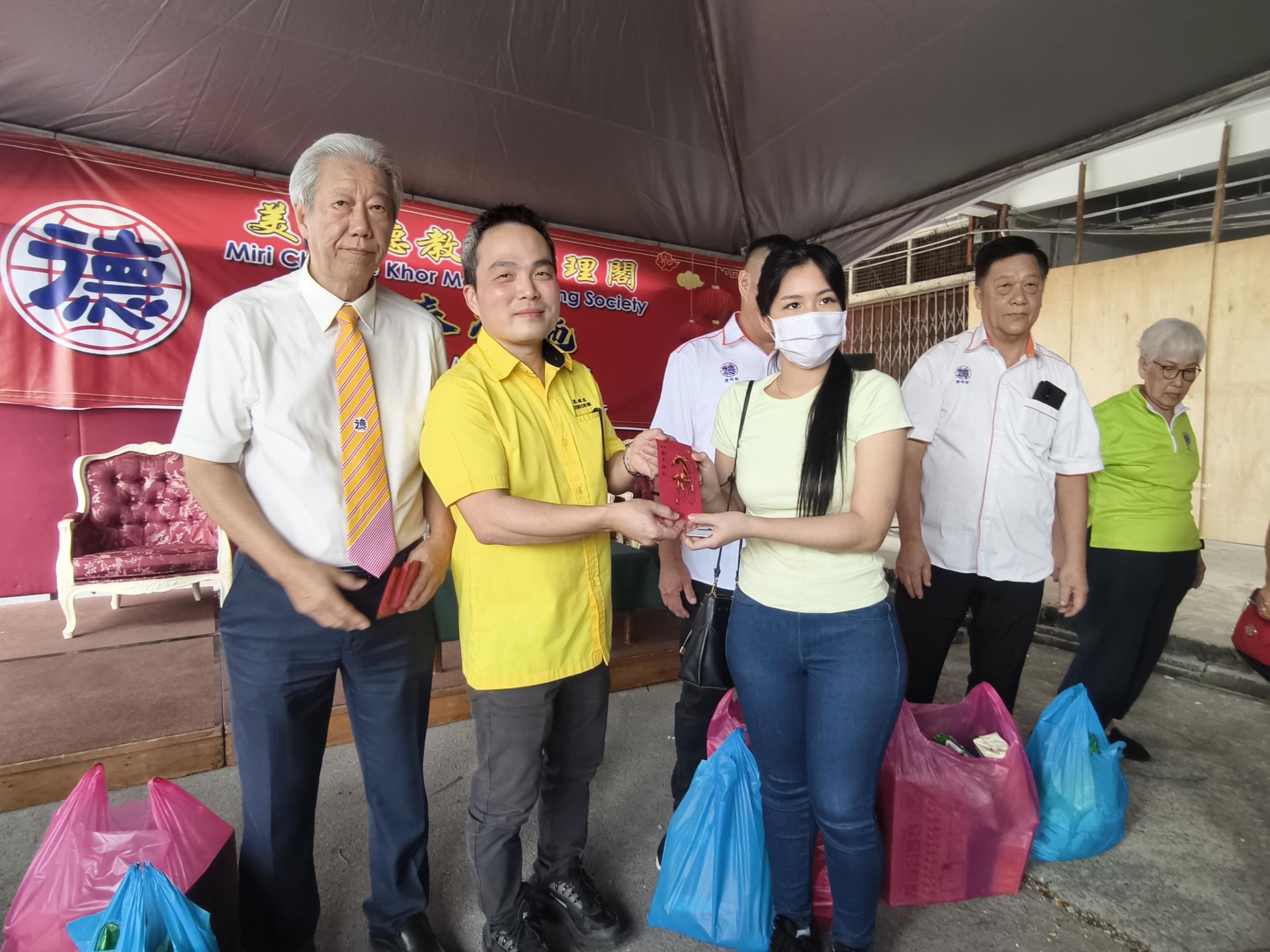 主宾美里市长兼埔奕区州议员俞小珊的代表张嵻洺(左2)分发移交新年红包予受惠者。左为紫理阁阁长贝清湛。