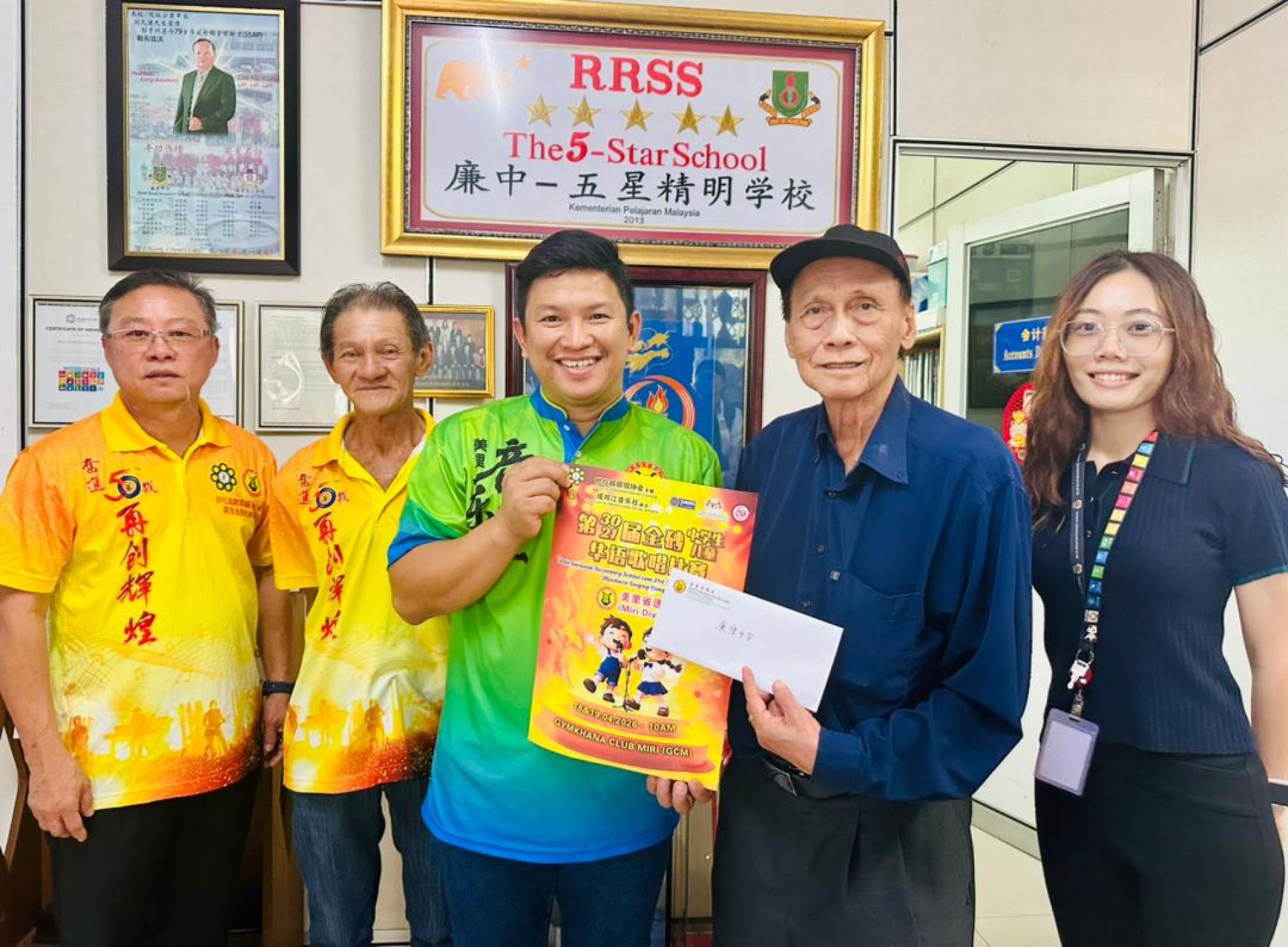 全砂儿童及中学生华语歌唱赛美里区选拔筹备会主席严昭兴(左2)移交参赛表格给美里培民中学,由校长贝美娇接取。