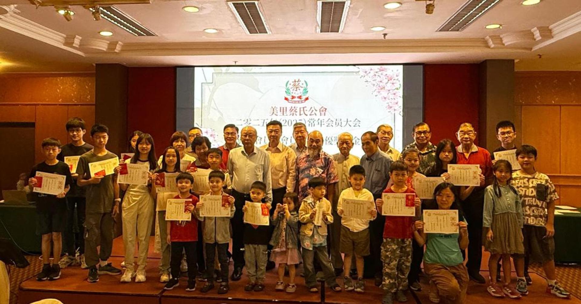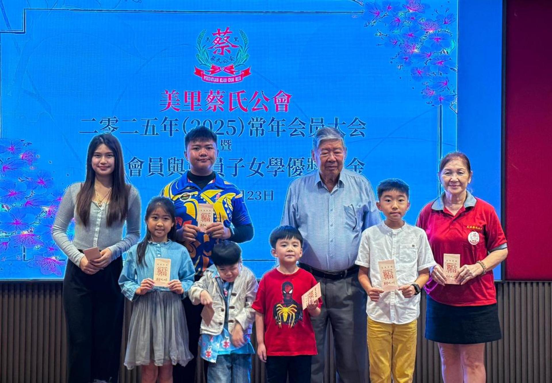 获得学优奖励金的会子女合影。 另一方面,该会副主席蔡增城亦以个人名义赞助设立“杰出宗亲特别奖励金”,旨在表扬在各领域表现突出的优秀宗亲子弟。他表示,希望这份心意不仅能激励获奖者再接再厉、持续突破,也能成为推动其他小宗亲向上学习、努力成为优秀人才的正面力量。