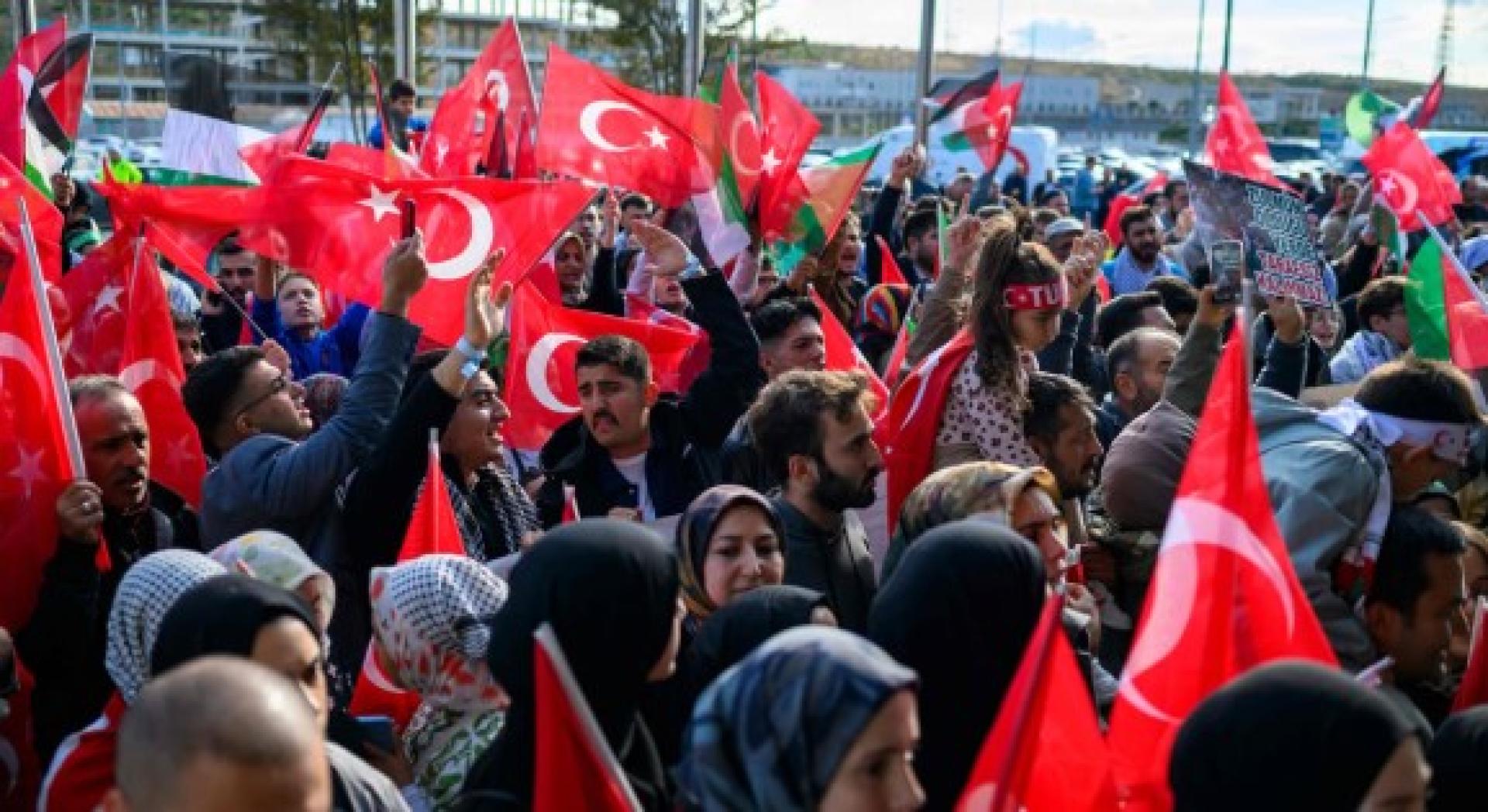 在伊斯坦布尔机场,土耳其活动人士的亲属在机场贵宾休息室等候,挥舞着土耳其和巴勒斯坦国旗,高呼“以色列凶手”。