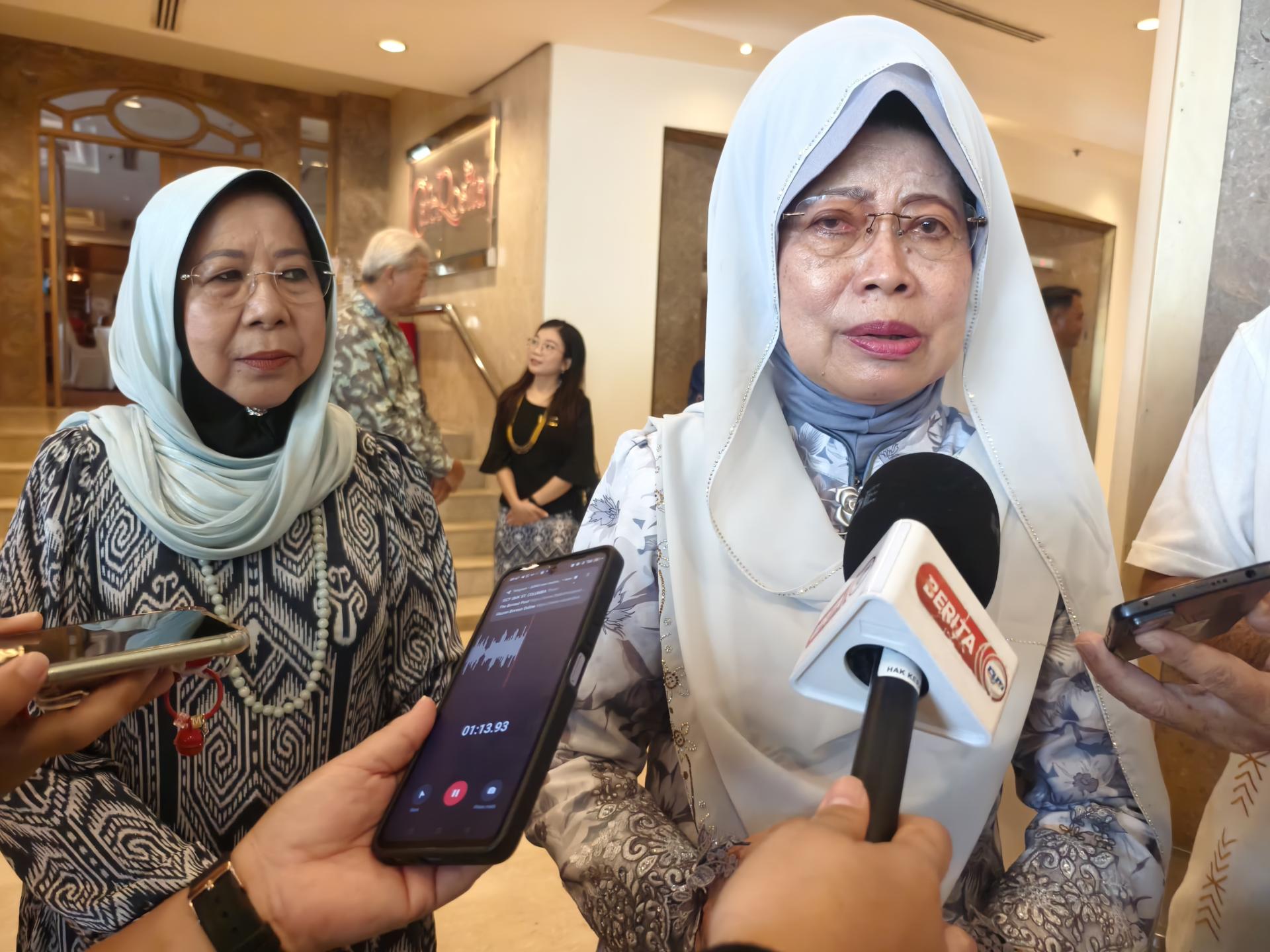砂拉越妇女、儿童及社区福祉发展部部长拿督斯里陈赛明接受媒体访问。左为副部长拿督罗茜尤努斯。
